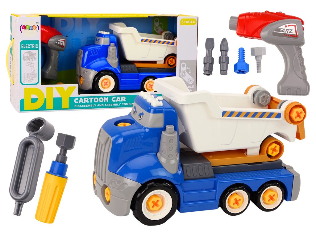 A Cartoon csavaros billenőkocsi egy lenyűgöző játék, amely bevezeti a gyerekeket a mechanika és az építőipar világába. A teherautó kék színe felkelti a kis szerelők figyelmét, felfedezésre és felfedezésre ösztönzi őket. A mellékelt szerszámkészletnek köszönhetően ezt a kocsit minden kis ezermester maga is szét- és összeszerelheti. A szerszámkészlet tartalmaz egy fúrót, csavarhúzót, csavarkulcsot és három cserélhető végsapkát, amelyek lehetővé teszik a gyermek számára, hogy megértse a teherautó összetett felépítését.