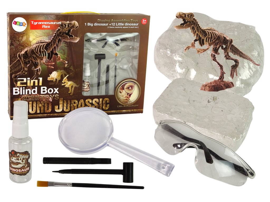 A készletben található eszközök segítségével felfedezheted egy nagy dinoszaurusz és két kisebb csontvázát. Két kő és kétszeres móka. Két kisebb csontvázat rejtély övez. Miután megtisztította a csontokat a mellékelt tartozékokkal, megtudhatja, milyen dinoszaurusz rejtőzött a kőben.
