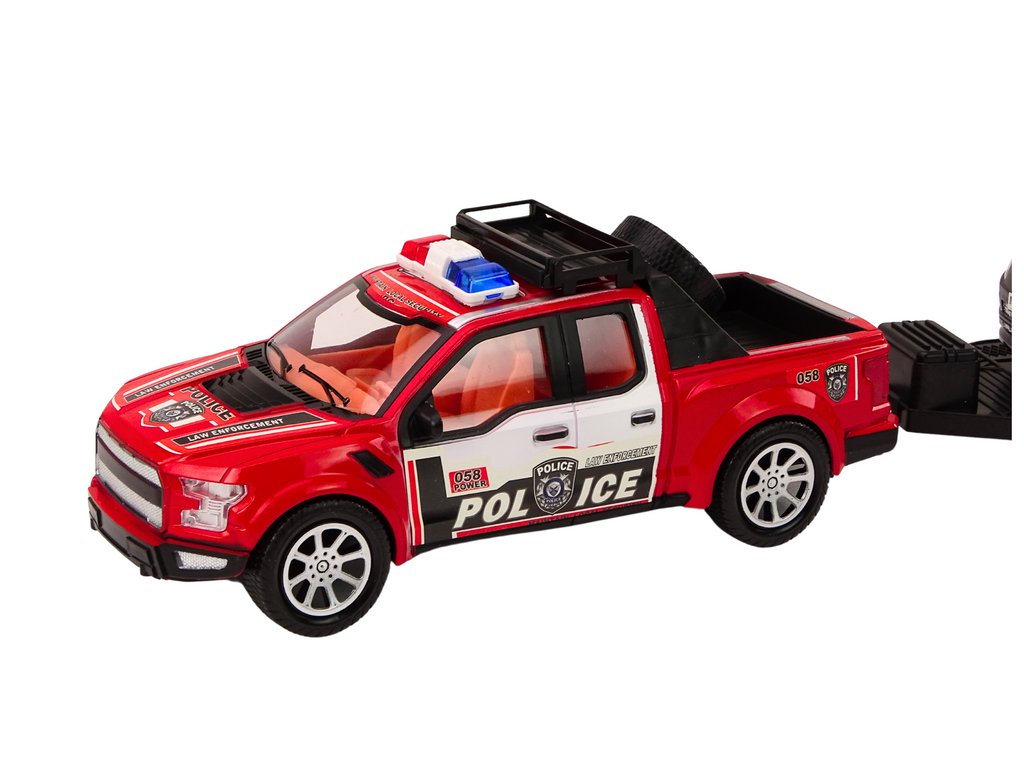 A piros pickup nagy fekete kerekekkel van felszerelve, amelyek stabilitást biztosítanak, és megkönnyítik az utánfutó terepjáróval történő vontatását. A kisteherautó valósághű kialakítású, és a karosszérián található "POLICE" felirat adja a hitelességet.