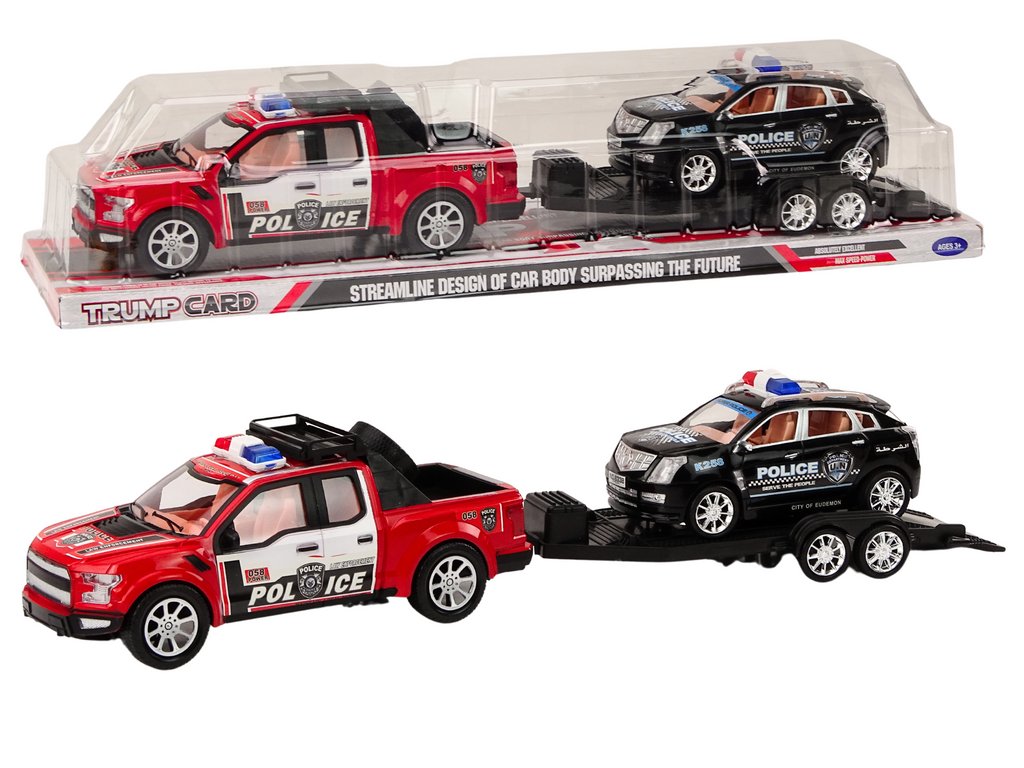A pótkocsis rendőrségi kisteherautó csodálatos készlet az autók és a rendőri játékok kis szerelmeseinek. A készlet egy piros rendőrautóból és egy utánfutóból áll egy fekete tereprendőr autóval.