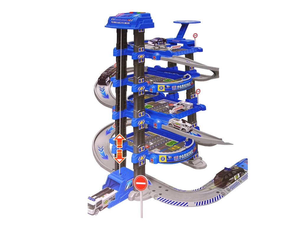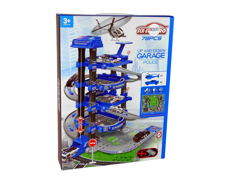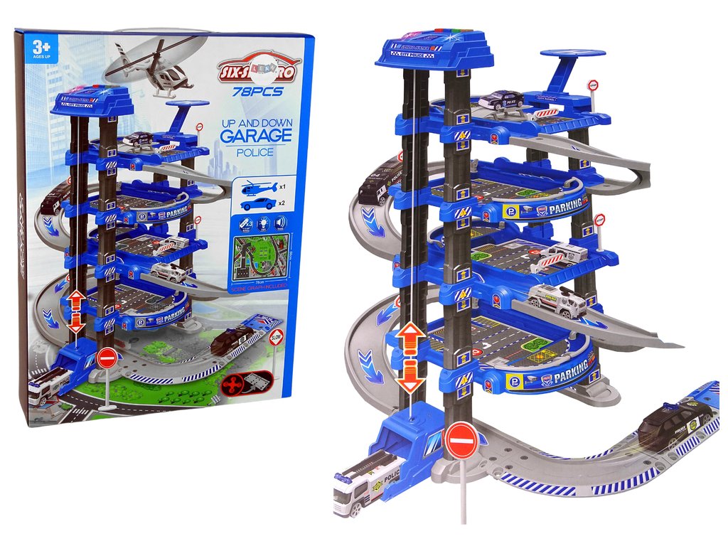 Többszintes garázst kínálunk minden 3 éves és annál idősebb gyermek számára. 4 szintes, mindegyiken csúszdával vagy lifttel közelíthető meg a játékkocsi. A lift fény- és hangeffektusokkal rendelkezik, fel-le jár. A garázs 78 elemből áll.