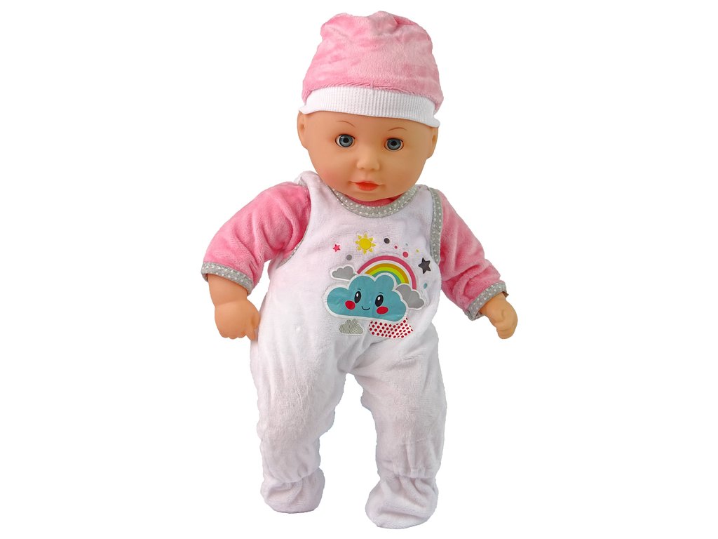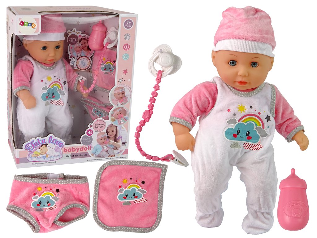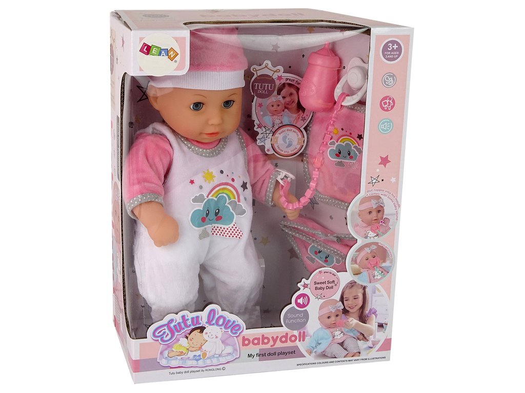 A babának csukódó szeme van, és cumit szív - csak tegyél egy üveget vagy cumit a baba szájába, és jellegzetes szopási hangokat fogsz hallani. A babának mozgatható karjai, lábai és feje van.