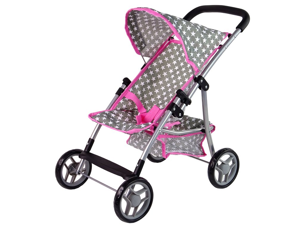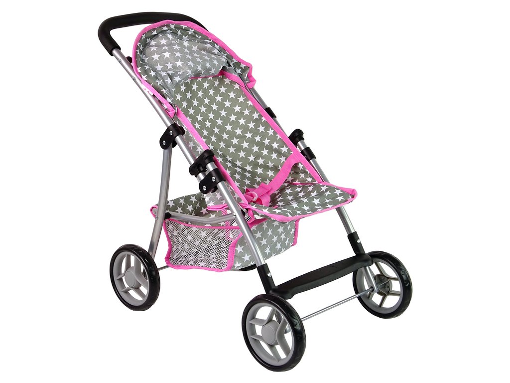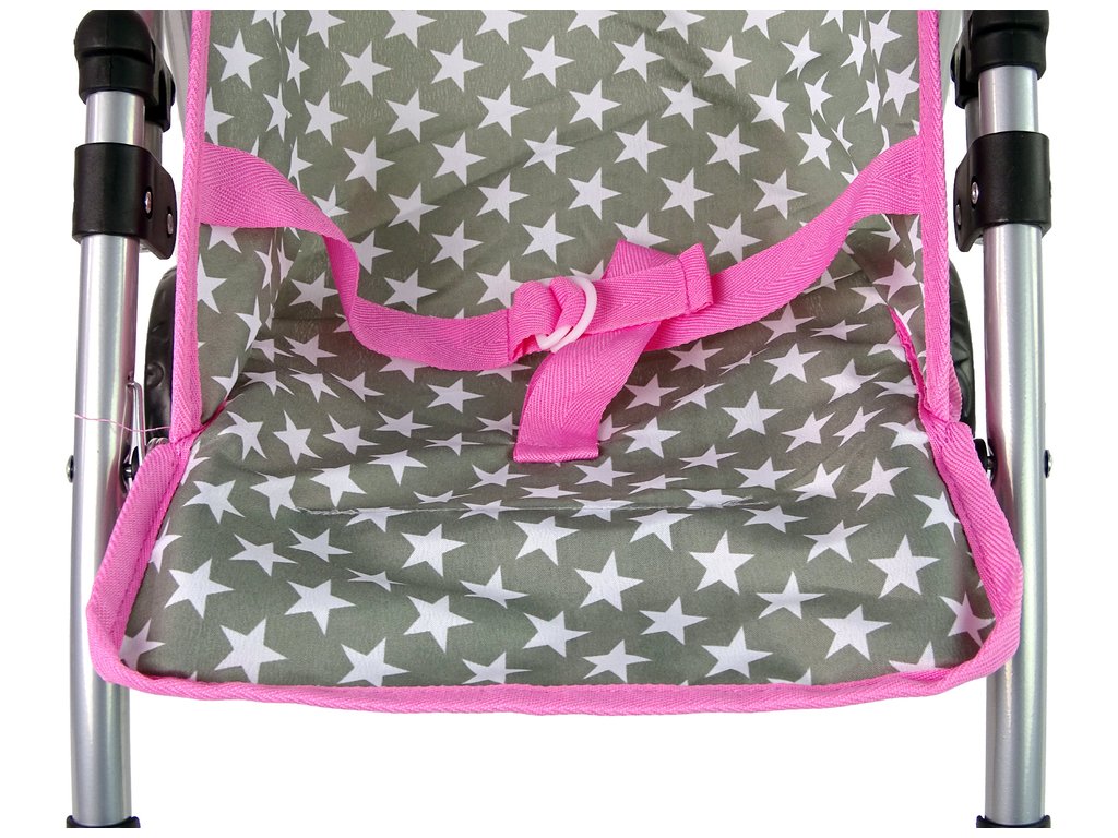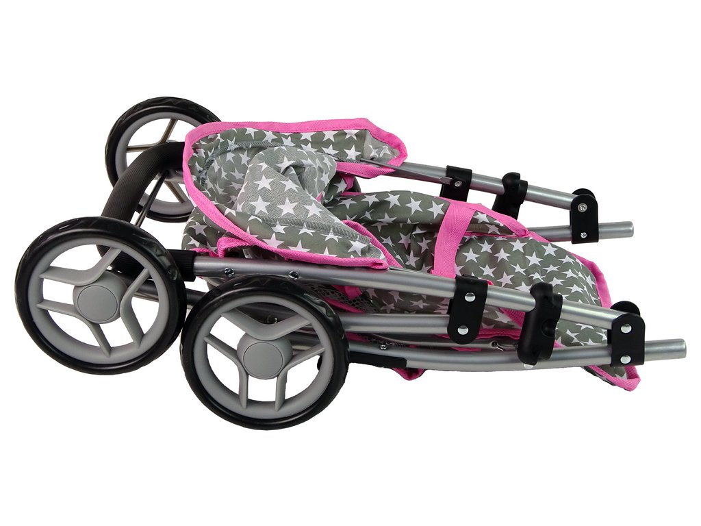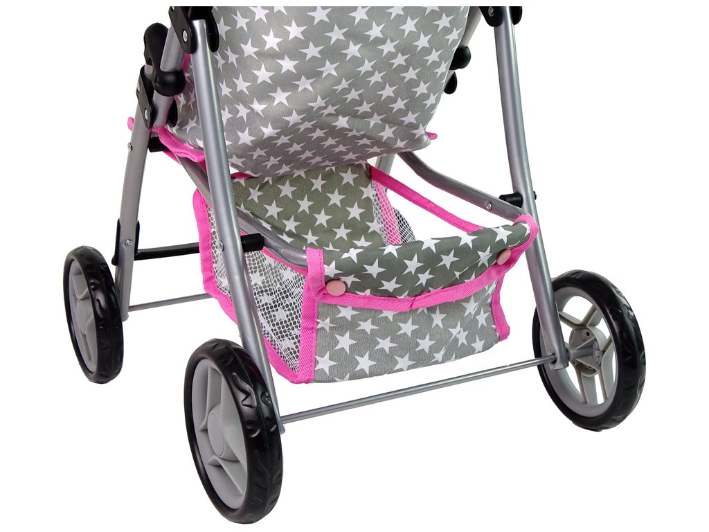 A babakocsi négy kerékkel van felszerelve, amelyek lehetővé teszik a könnyű vezetést még egyenetlen felületeken is. A szürke szín fehér csillagokkal és rózsaszín szegéllyel játékra ösztönzi a lányt. Az ülés alatt van egy kis tárolóhely az apróságoknak és a babához és gyermekéhez szükséges dolgoknak. További előnye, hogy összecsukható, könnyen elfér az autóban, és egy családi kirándulásra is elvihetjük.