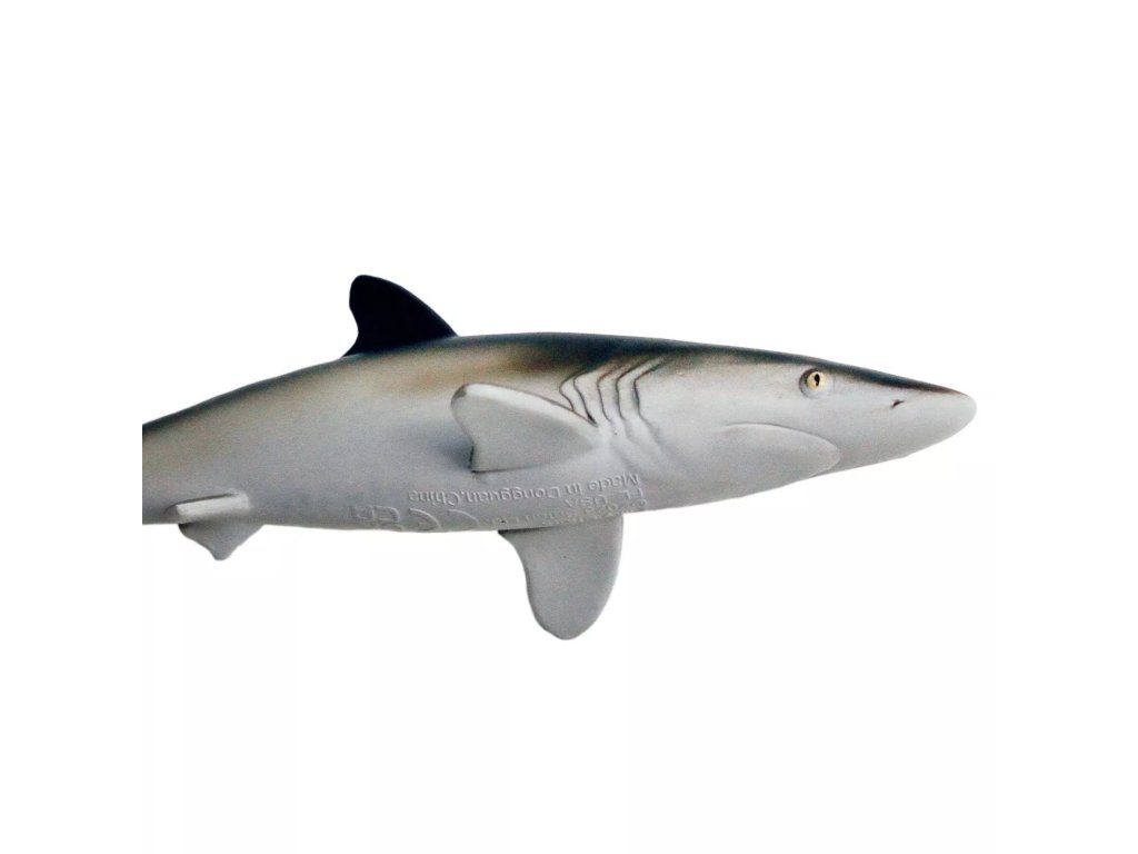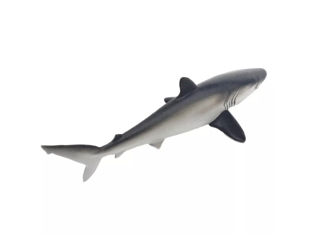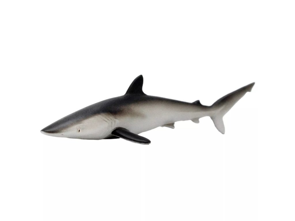 Egy nagy, karcsú cápa részletes figurája, amely a nyílt tengeren, a szárazföld közelében található. Különféle halfajokkal táplálkozik, és a természetben általában távolabb mozog a parttól.