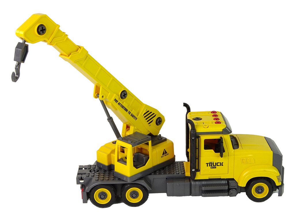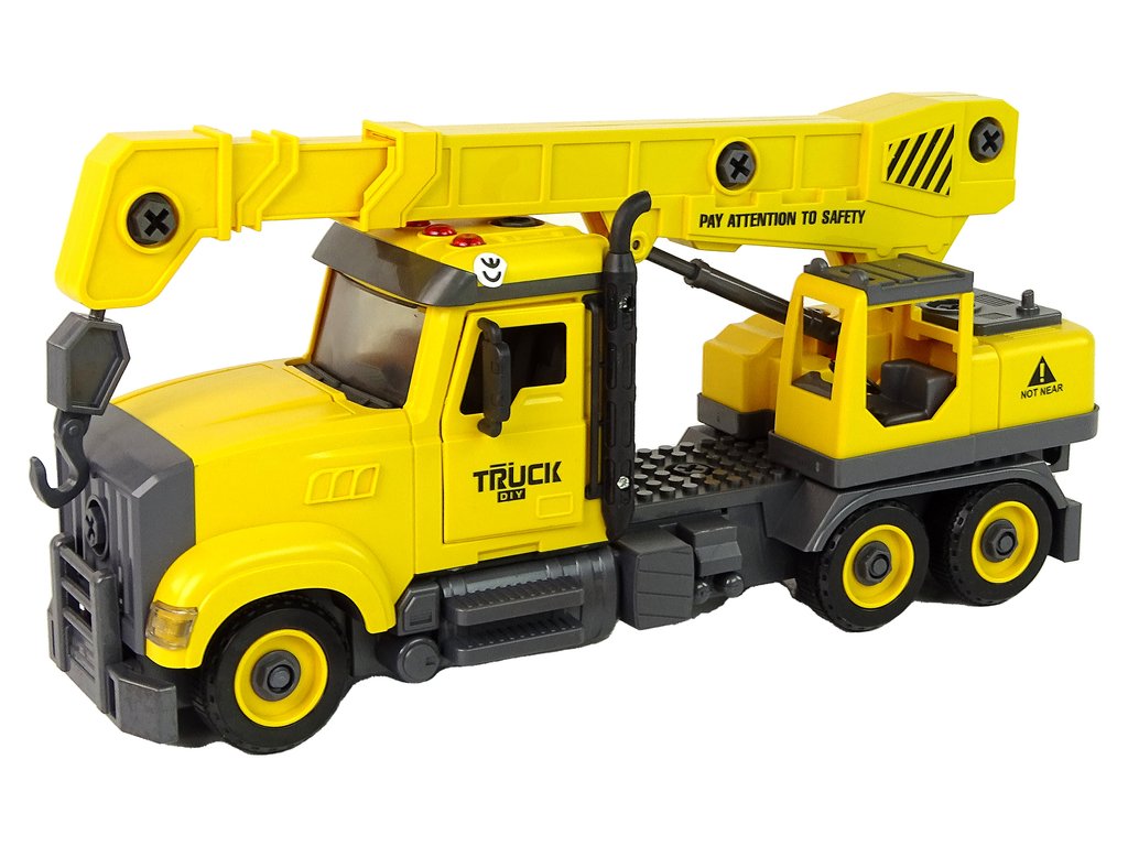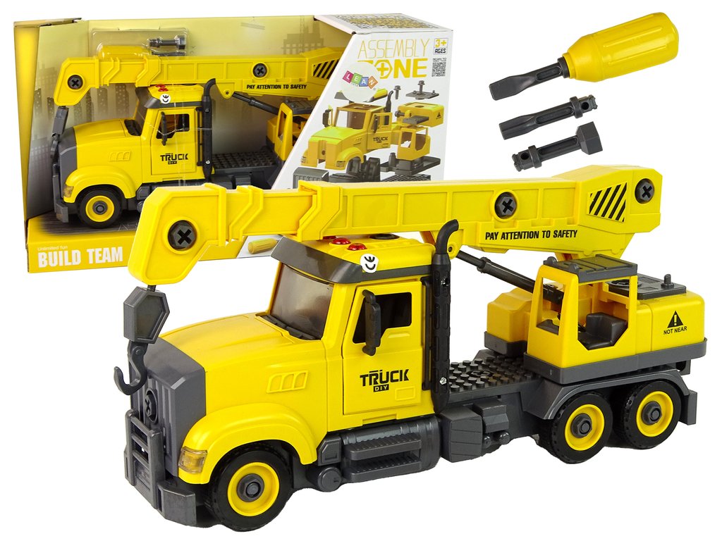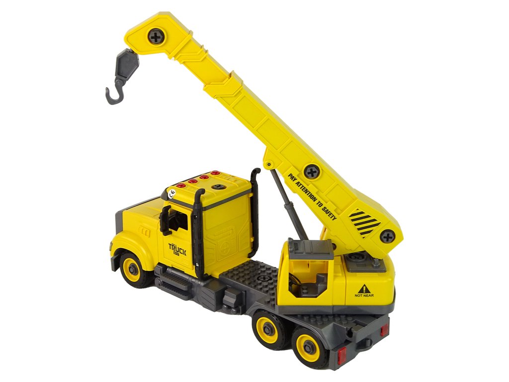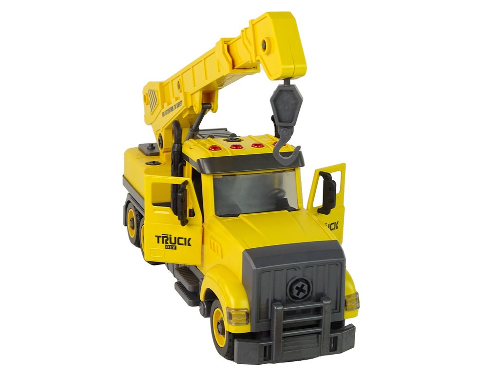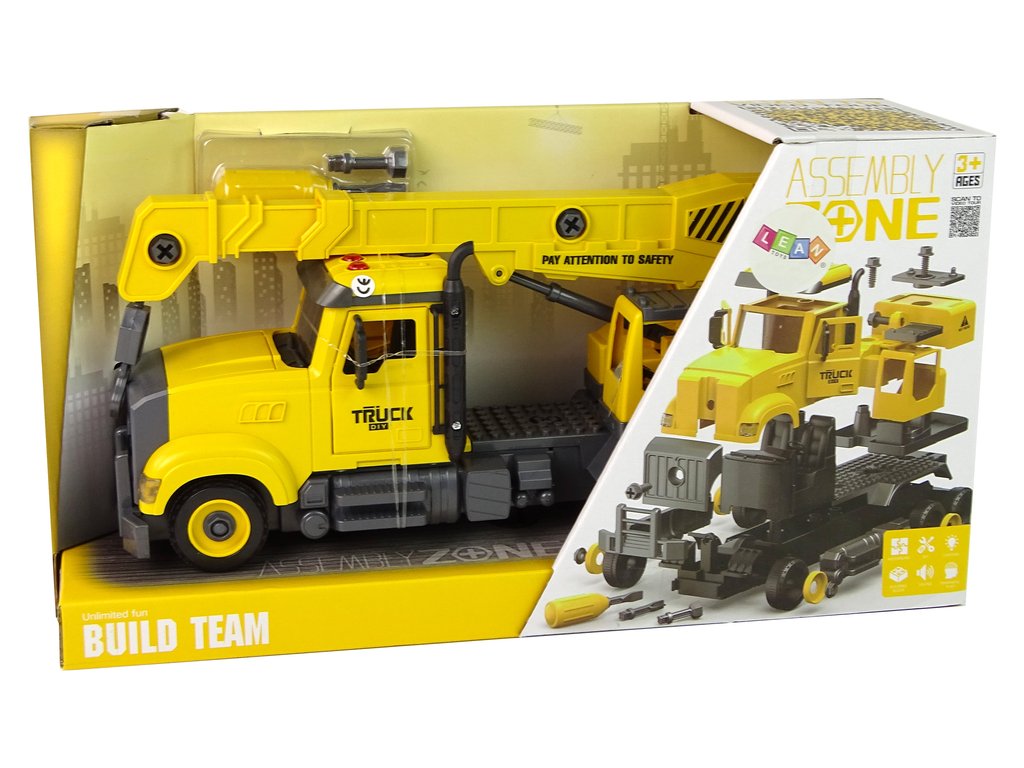 Sárga teherautó daruval szét- és összeszereléshez