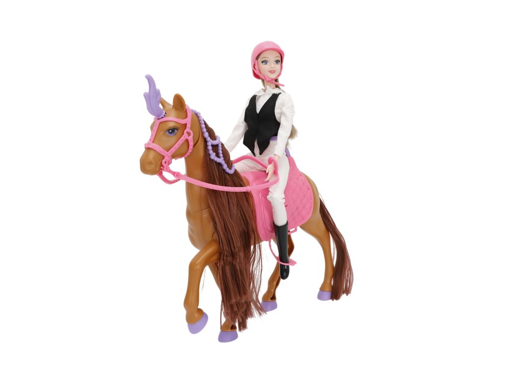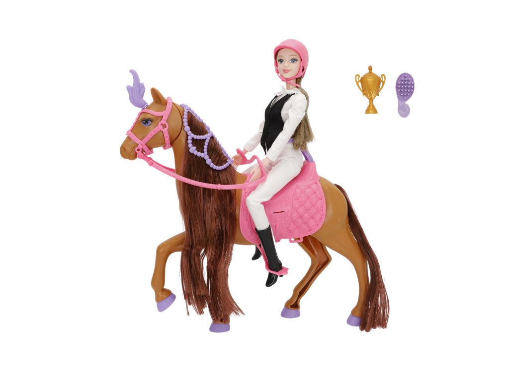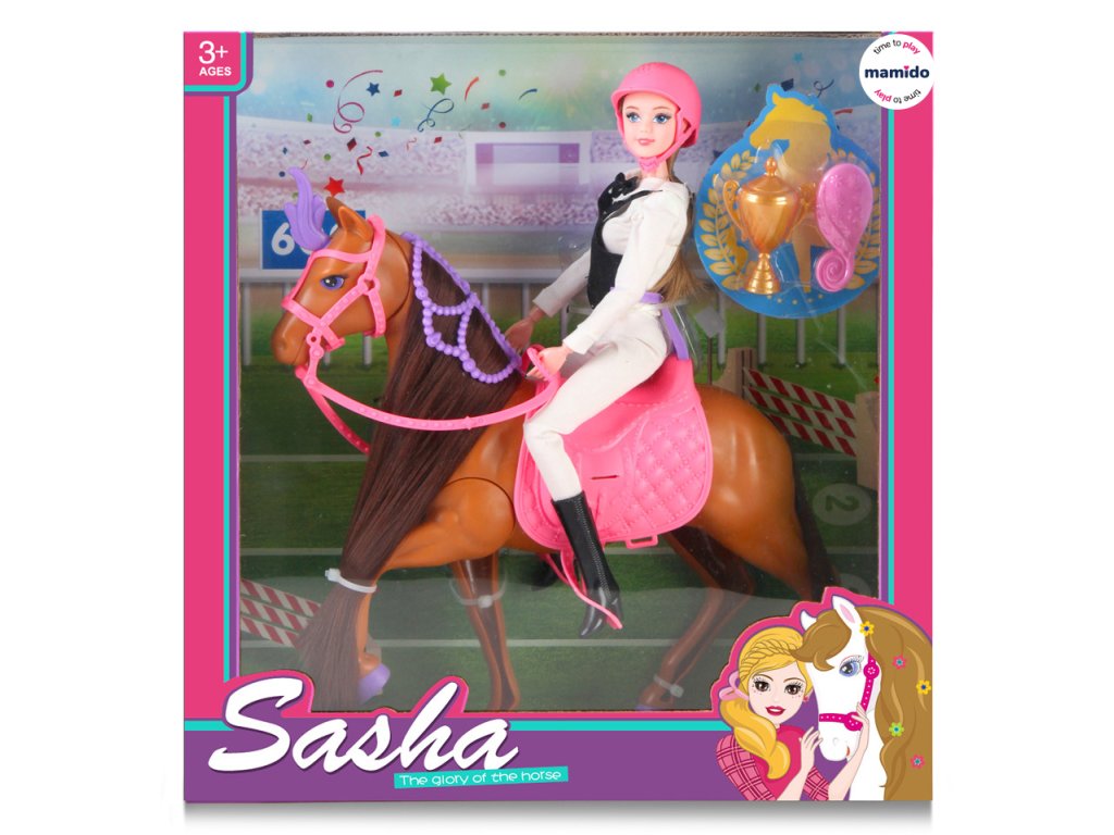 Indulj el lovasversenyre Sasha babával és elegáns lovával. A baba stílusos lovasruházatot visel sisakkal, és a lova gyönyörű, rózsaszín kantárral díszített sörénnyel rendelkezik. A mellékelt fésűnek köszönhetően kedved szerint fésülheted és díszítheted a ló sörényét. A verseny győztesének járó trófea sem hiányzik, ami még szórakoztatóbbá teszi a játékot. A játék 3 éves kortól alkalmas gyermekek számára