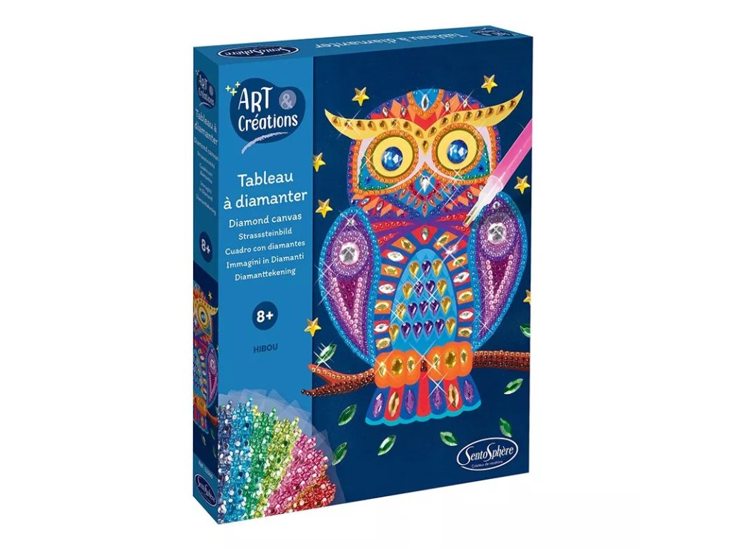 Vegyél fel egyenként gyémántokat a toll segítségével a vásznon lévő színkódolt mezők szerint, és helyezd őket egymás mellé a ragasztós vászonra. Fokozatosan egy összefüggő bagoly motívum jön létre, amelyet befejezés után ajándékba lehet adni, vagy díszítheted vele a szobádat.