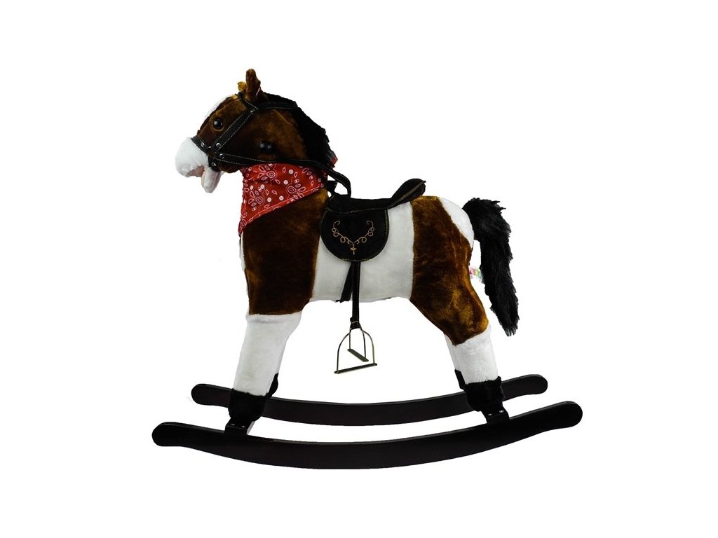 A hintaló puha plüssből készült, fa fogantyúval és fa talppal rendelkezik. Vágtató és morgó hangokat ad ki. Nagyszerű játék minden kis cowboy számára. Sötétbarna színű, fehér részekkel kiegészítve.