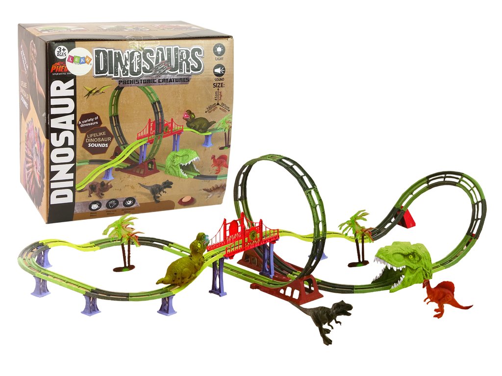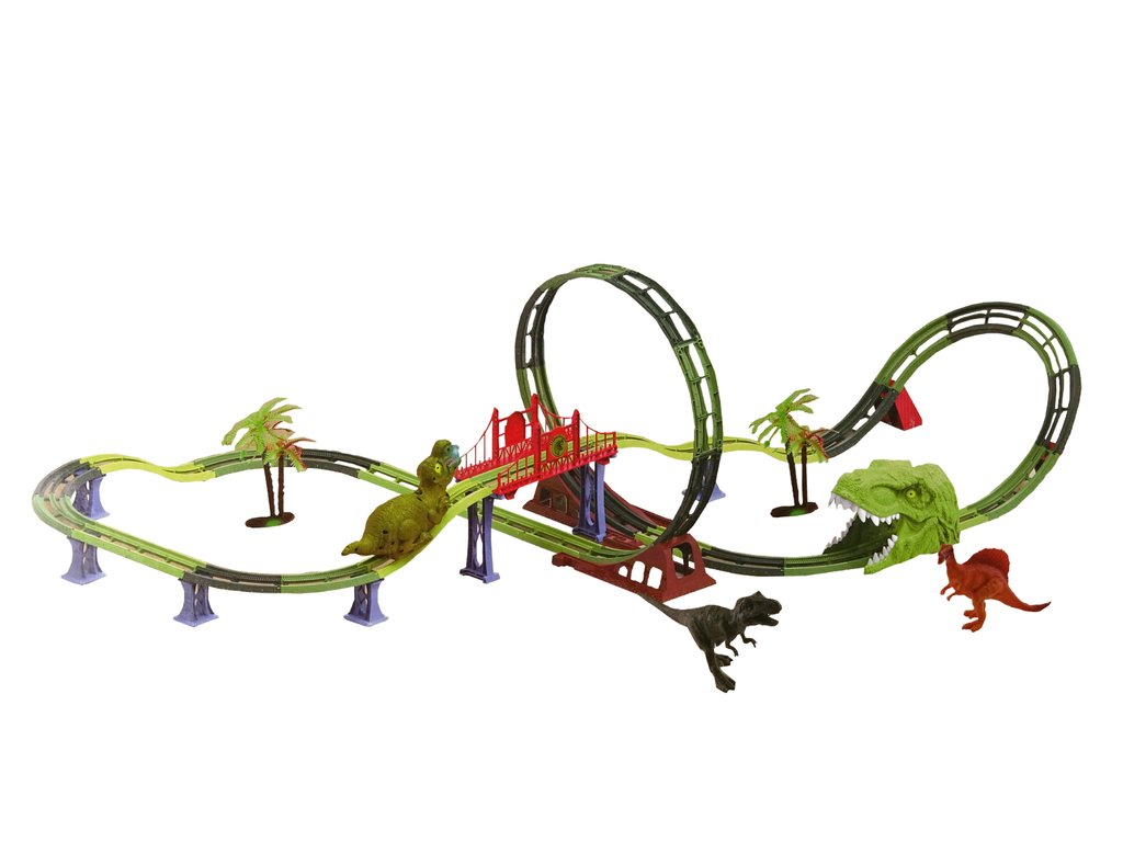A nagy pálya hidakból, alagutakból és egy nagy spirálból áll. A készlet tartalmaz egy kerekeken lévő dinoszauruszt, amely pályán mozog. A figura világít és hangokat adhat ki. Igazi ordítás, mint egy dinoszaurusz! Kapcsolja be a kapcsolót, és nézze meg, ahogy lefelé zúdul a pályán!