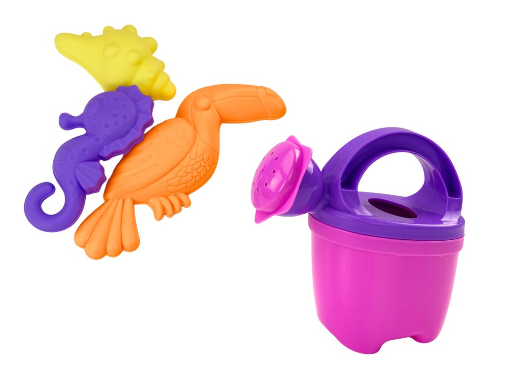 A készlet tartalmazza a homokos játékhoz szükséges eszközöket is: lapát, gombóc, teáskanna és három forma.