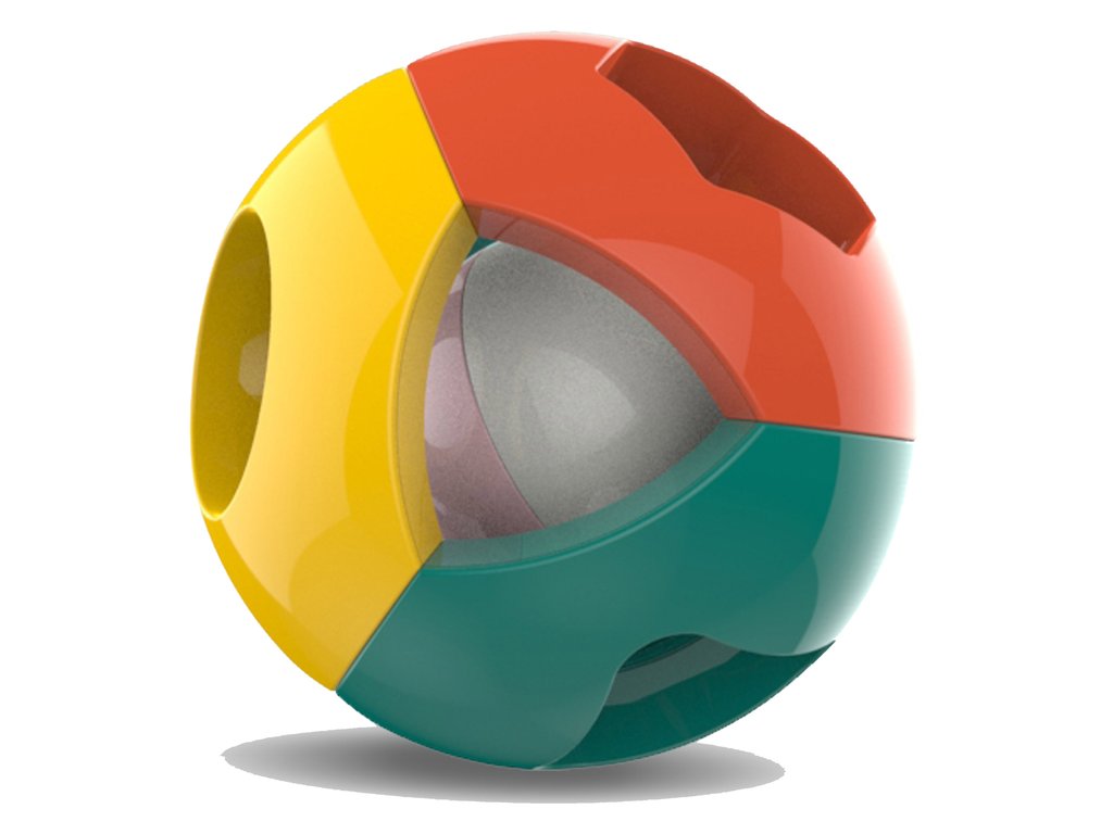A csörgő könnyen megfogható és a gyerekek kezében tartható. A gömb belsejében zörgő kis golyó. Amikor játszik vele, a kisgyermek csak rá összpontosítja a figyelmét. A labdának lekerekített élei vannak, így teljesen biztonságosak a kisgyermekek számára. Mindegyik falon háromszög, hatszög alakú nyílás található.