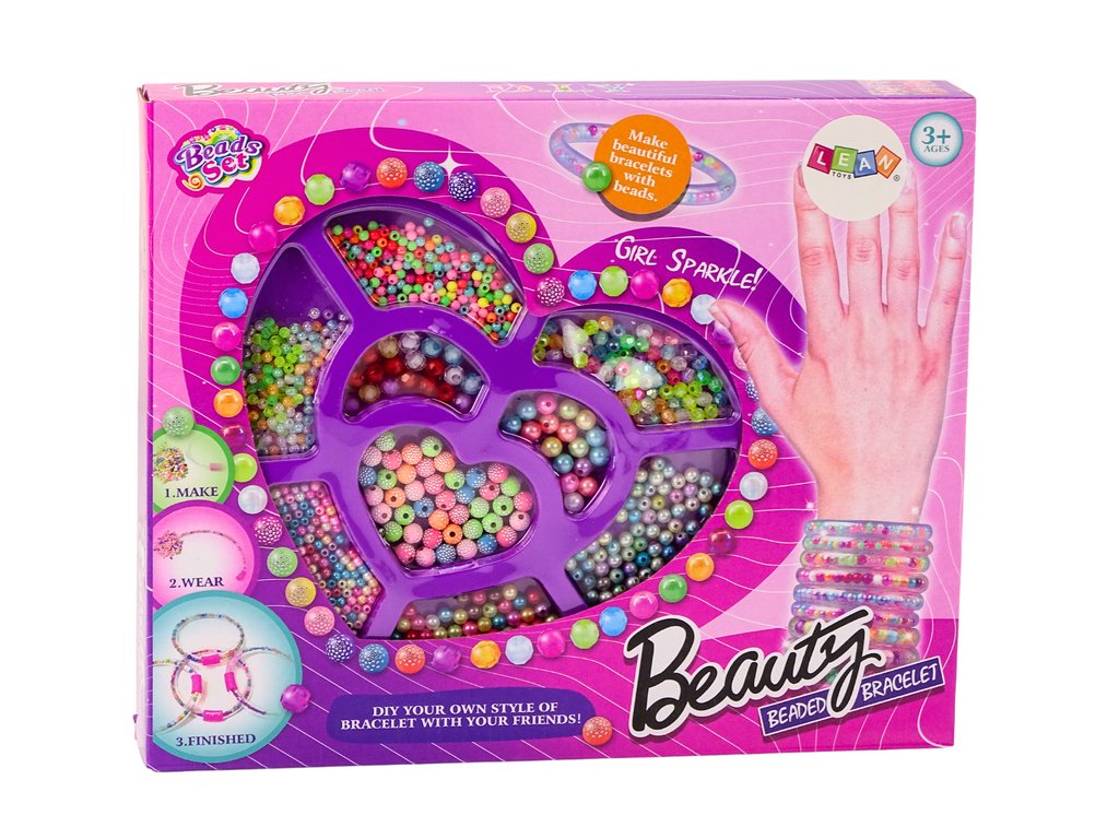 A készlet sokféle gyöngyöt tartalmaz. A különféle méretekkel, formákkal és színekkel a gyerekek egyedi mintákat készíthetnek, és fejleszthetik kreativitásukat. A készletben gyöngyökkel tölthető átlátszó csövek is találhatók. Ezáltal gyönyörű és egyedi karkötők készíthetők, amelyek a csövek belsejében lévő gyöngyök mozgatásával könnyen cserélhetők.