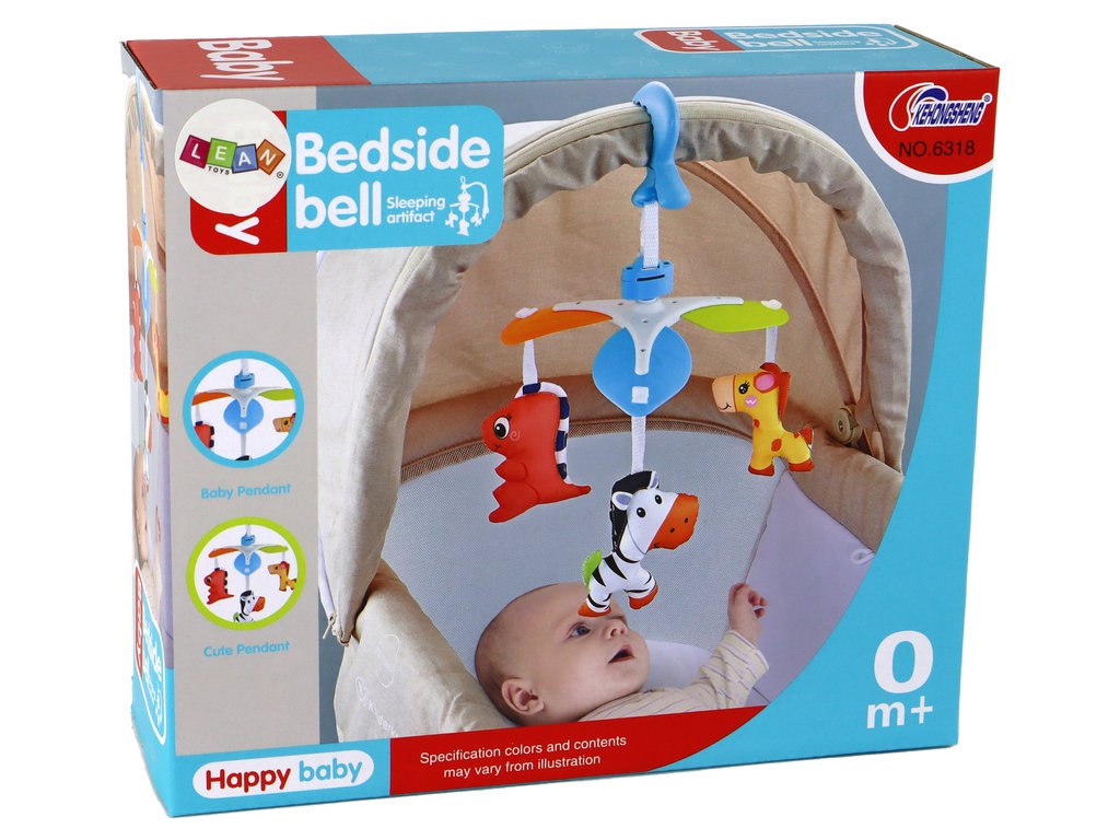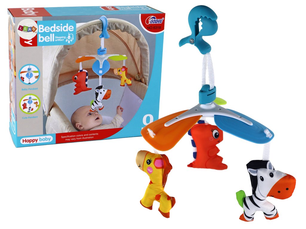 A készlet három plüss színes állatot tartalmaz: egy zsiráfot, egy dinoszauruszt és egy zebrát. Mindegyik állat puha tapintású és alkalmas csecsemők számára. Világos, intenzív színeik felkeltik a kisgyermek figyelmét és serkentik érzékszervi fejlődését.