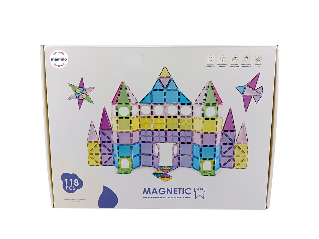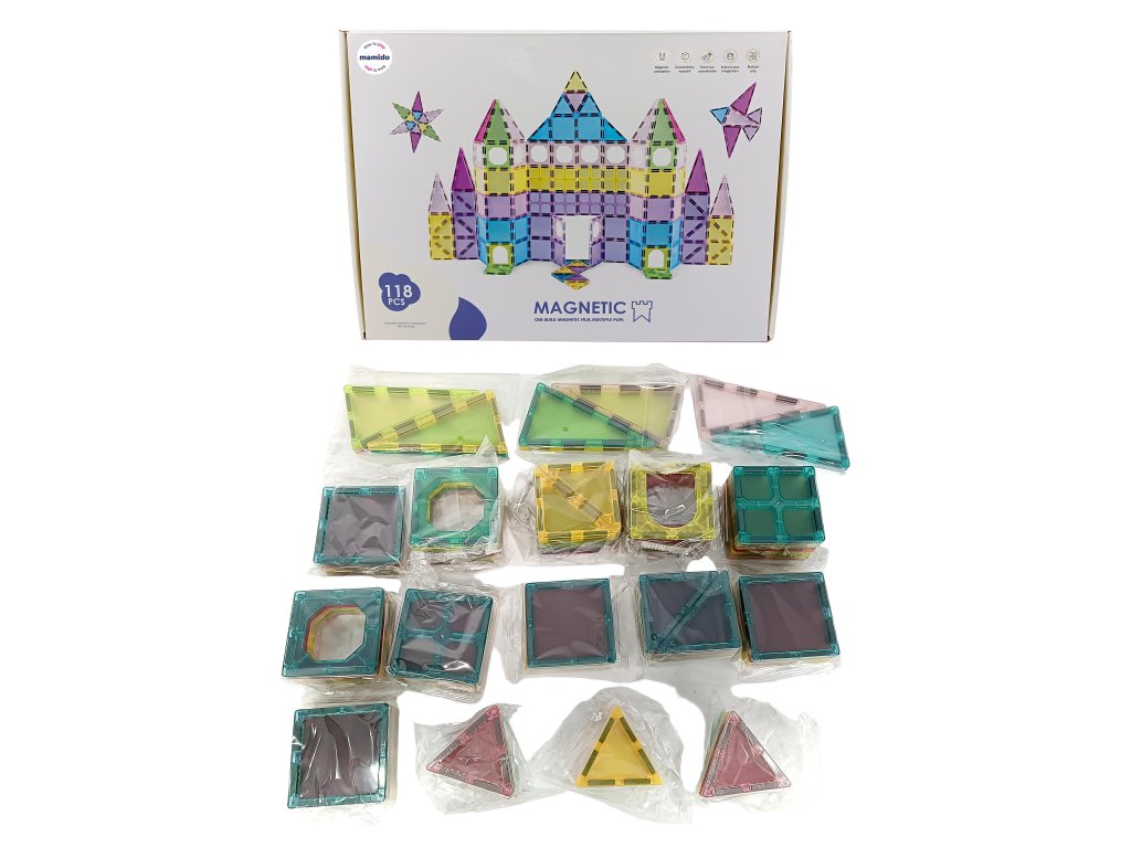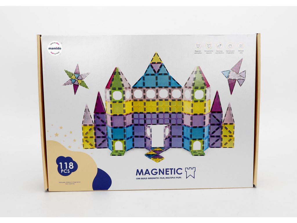 Varázslatos készlet 118 darab 7,5 cm-es mágneses építőkockából, amely megnyitja a fantázia világát, ahol a gyerekek várakat, házakat, tornyokat és saját színes világokat építhetnek. Az átlátszó darabok gyönyörű fényhatásokat keltenek, és az erős mágneseknek köszönhetően kiválóan tartanak. Az építőkészlet ideális azoknak a kis építőknek, akik imádják a formák kreatív kombinálását.