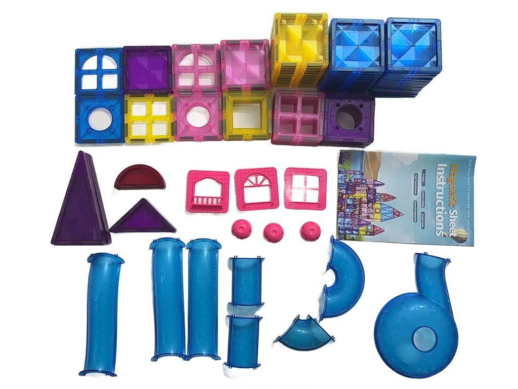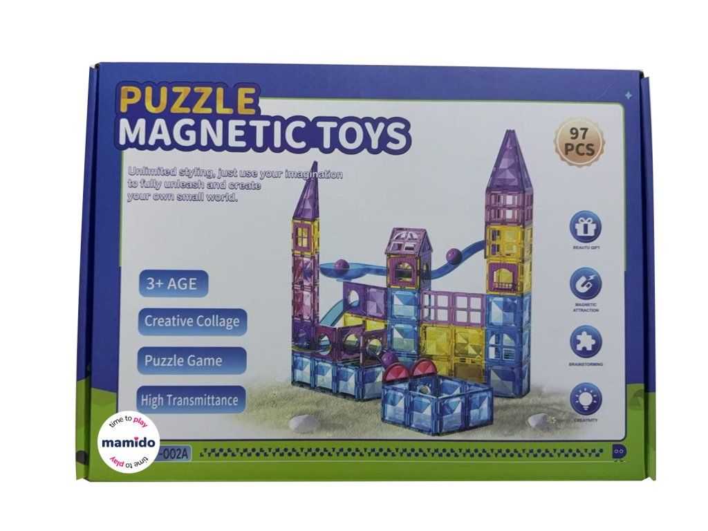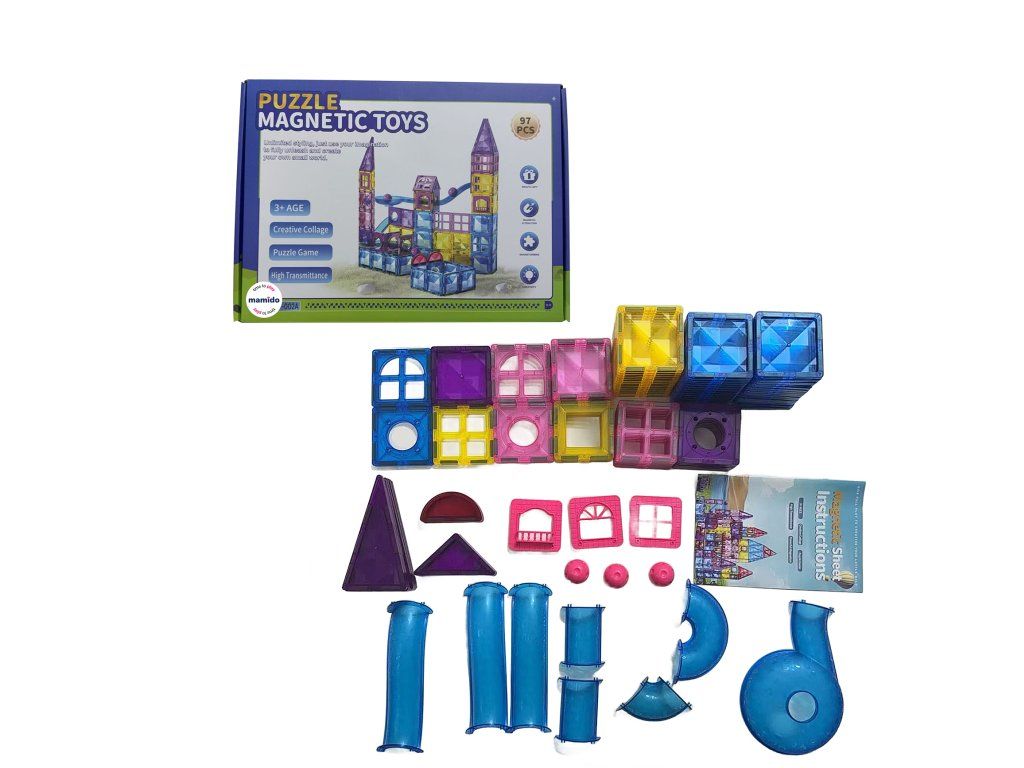 Varázslatos, 97 színes elemet tartalmazó mágneses építőkészlet lehetővé teszi a gyerekek számára, hogy mesebeli várakat, kisvárosokat és vidámparkokat építsenek. Az egyszerű mágneses rendszernek köszönhetően az elemek könnyen össze- és szétszerelhetők, így a gyerekek folyamatosan változtathatják a formákat és új kombinációkat építhetnek. Az építőkockákból például álomvárat, szélmalmot, vidámparkot, varázslatos házikót, hidakat vagy a Neon City nevű várost lehet építeni.