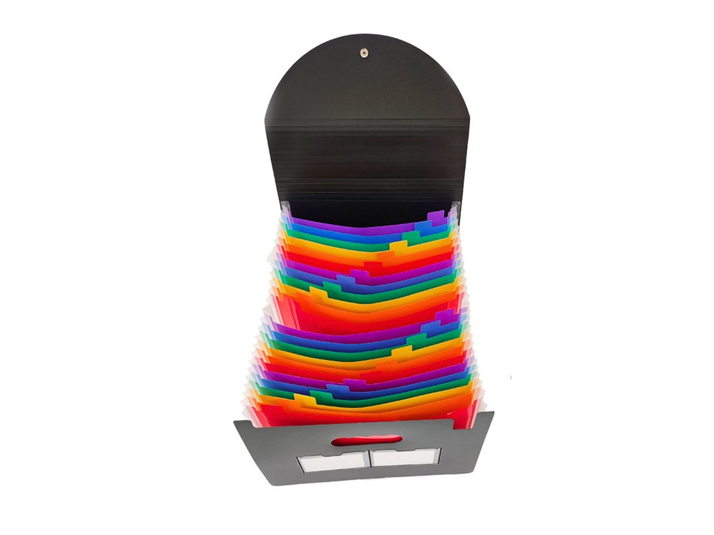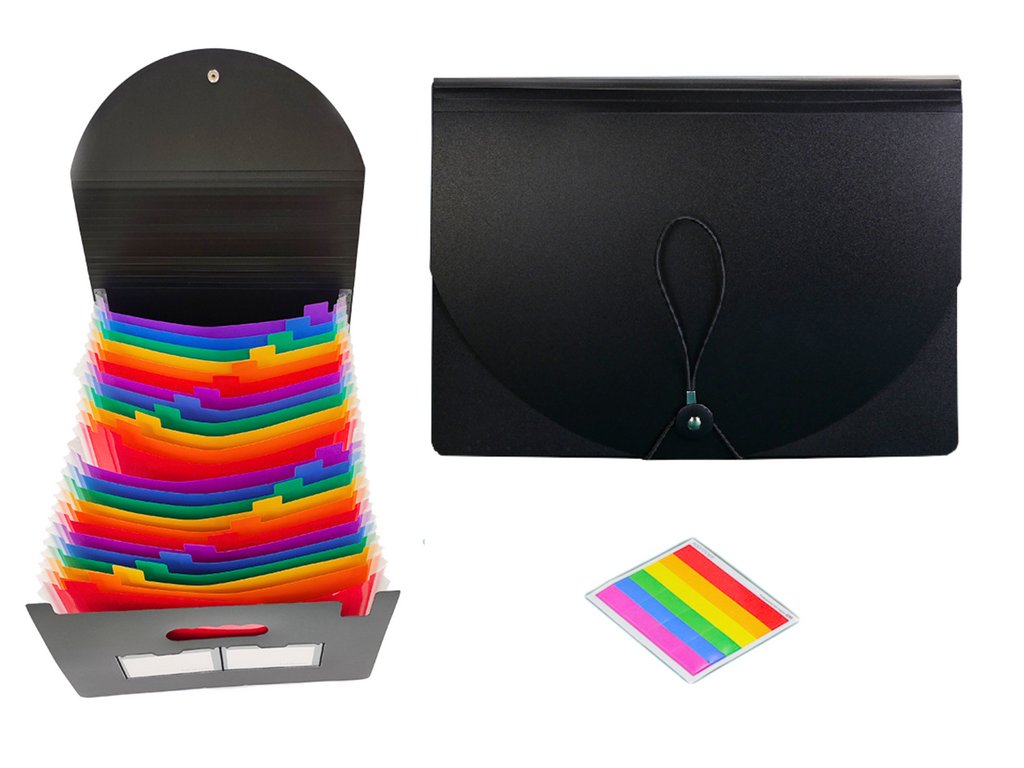 A tartós, nem deformálódó anyag garantálja a hosszú távú használatot és ellenáll a mindennapi kopásnak. A mappa legfeljebb 24 zsebet tartalmaz A4-es dokumentumok számára, amelyek mindegyike más-más színárnyalatú, lehetővé téve a könnyű és gyors válogatást és a dokumentumokhoz való hozzáférést. Mindegyik zseb elég tágas ahhoz, hogy több száz papírlap elférjen, így a mappa ideális eszköz nagy mennyiségű dokumentum tárolására. A zsebek jelölővel jelölhetők, ami megkönnyíti a rendszerezést és a szükséges dokumentumok megtalálását. Ez lehetővé teszi az egyes zsebek tartalmának gyors azonosítását.