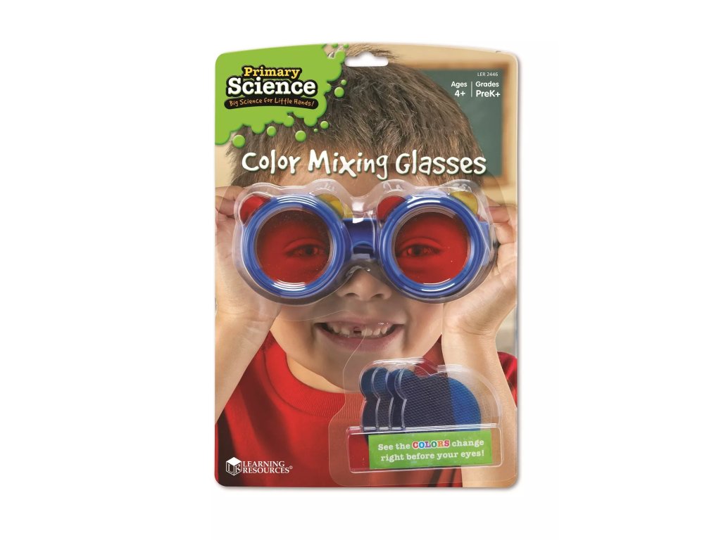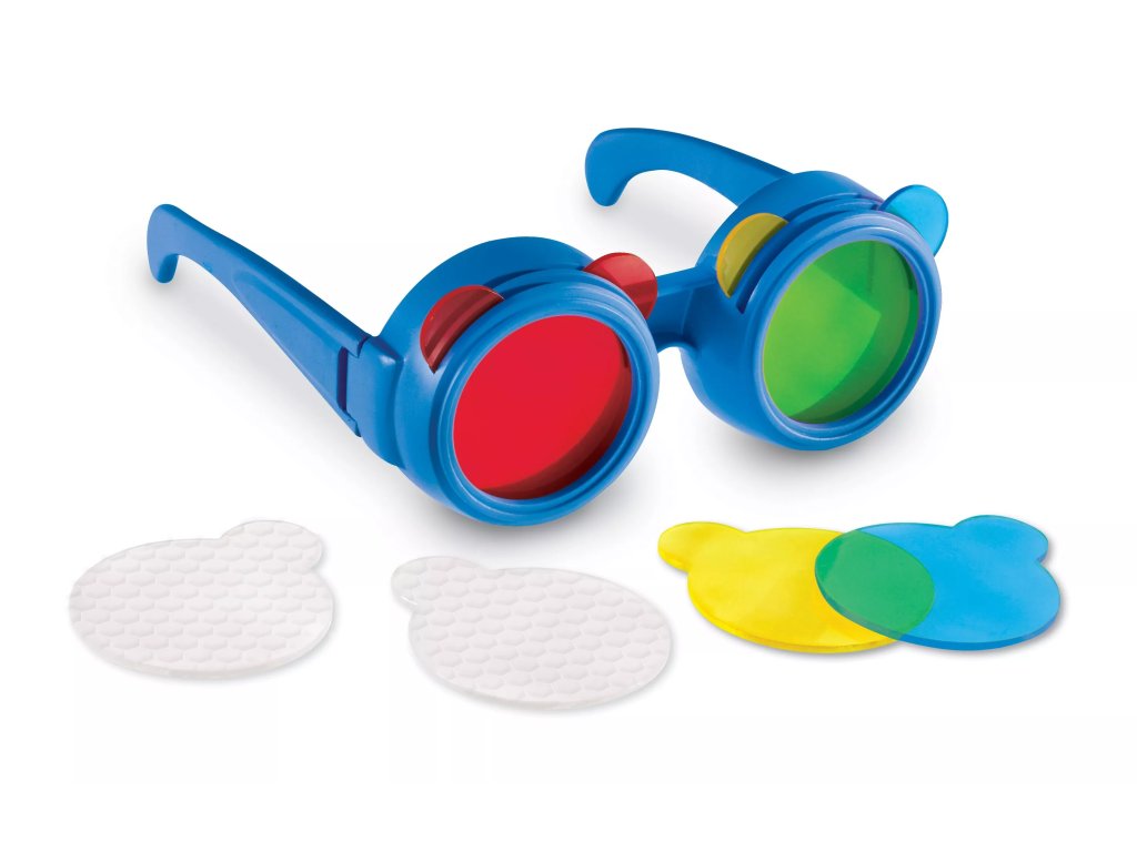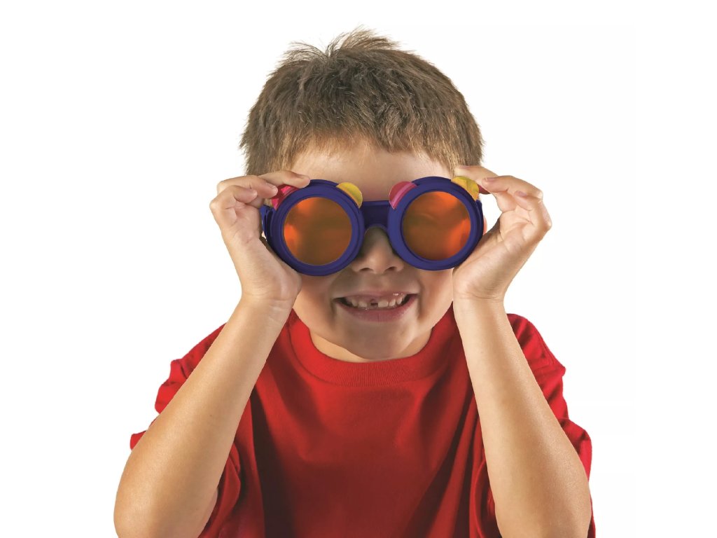 Gyerek szemüveg cserélhető színes lencsékkel, melyek a színekkel való kísérletezésre és a különböző árnyalatok megismerésére szolgálnak. A szerkezet figyelembe veszi a gyermekek általi könnyű kezelést.