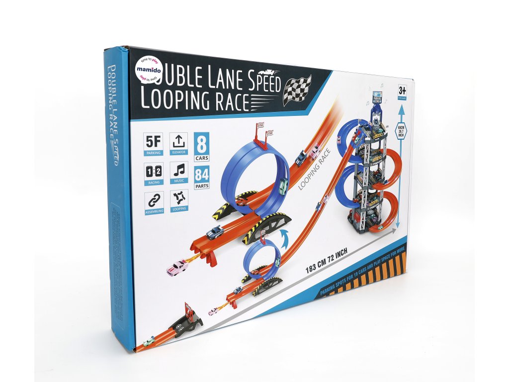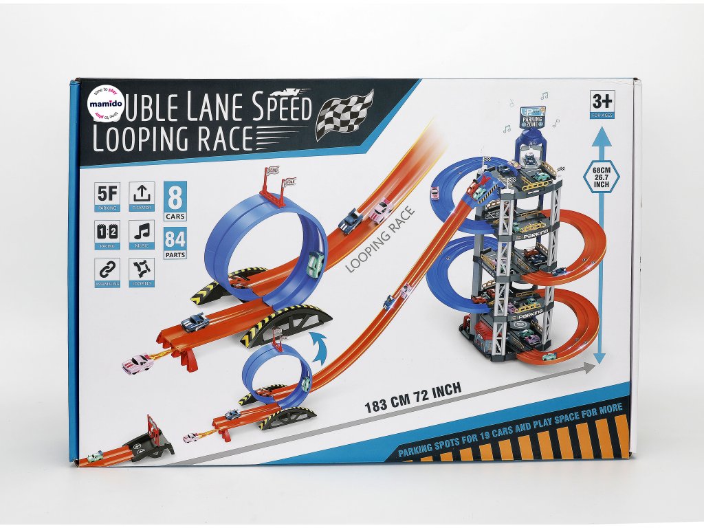 - Felépítés: 5 emeletes parkoló lifttel, csúszdával és hurokkal ellátott pályával