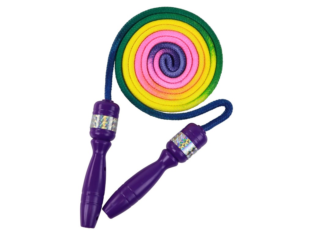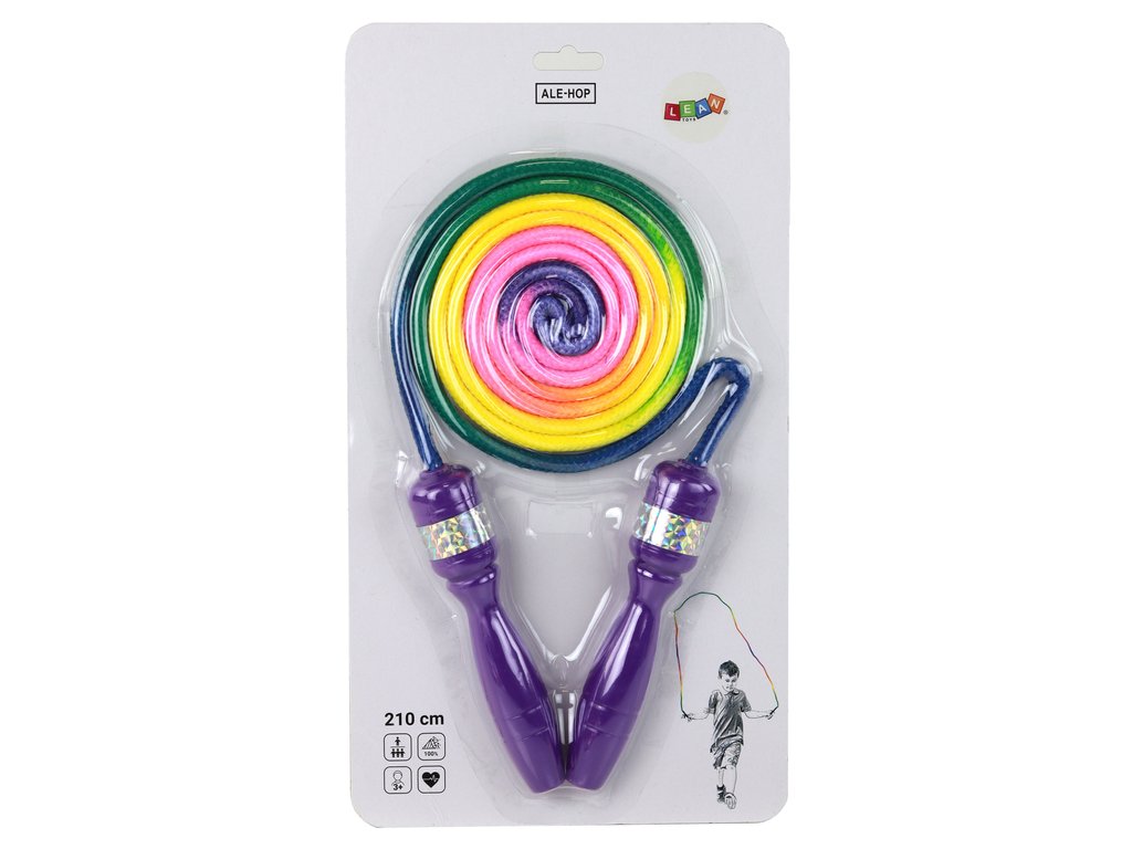Egy nem mindennapi ugrókötelet szeretnénk bemutatni a szivárvány színeiben, lila fogantyúval. Az ugrókötél továbbra is népszerű játék az egyszerűsége és a szórakozás miatt, ami mind a gyerekeknek, mind szüleiknek örömet okoz.