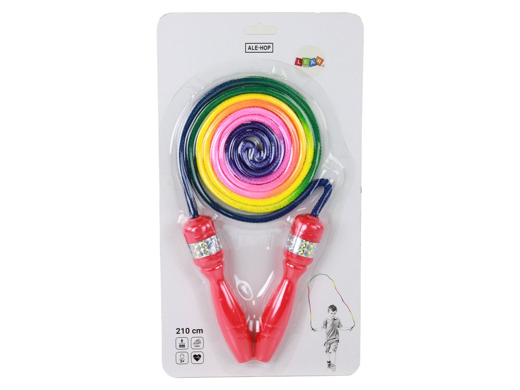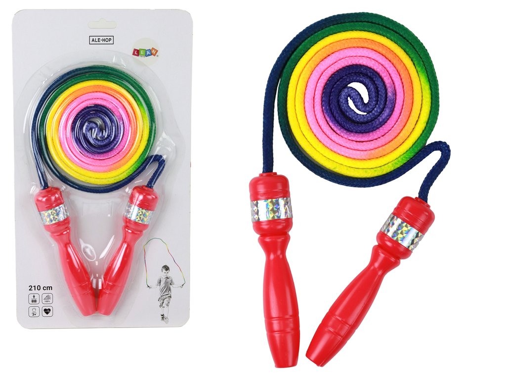 Egy szokatlan ugrókötelet szeretnénk bemutatni szivárvány színekben, piros fogantyúval. Az ugrókötél továbbra is népszerű játék, egyszerűsége és szórakozása miatt, amely mind a gyerekeknek, mind szüleiknek örömet okoz.