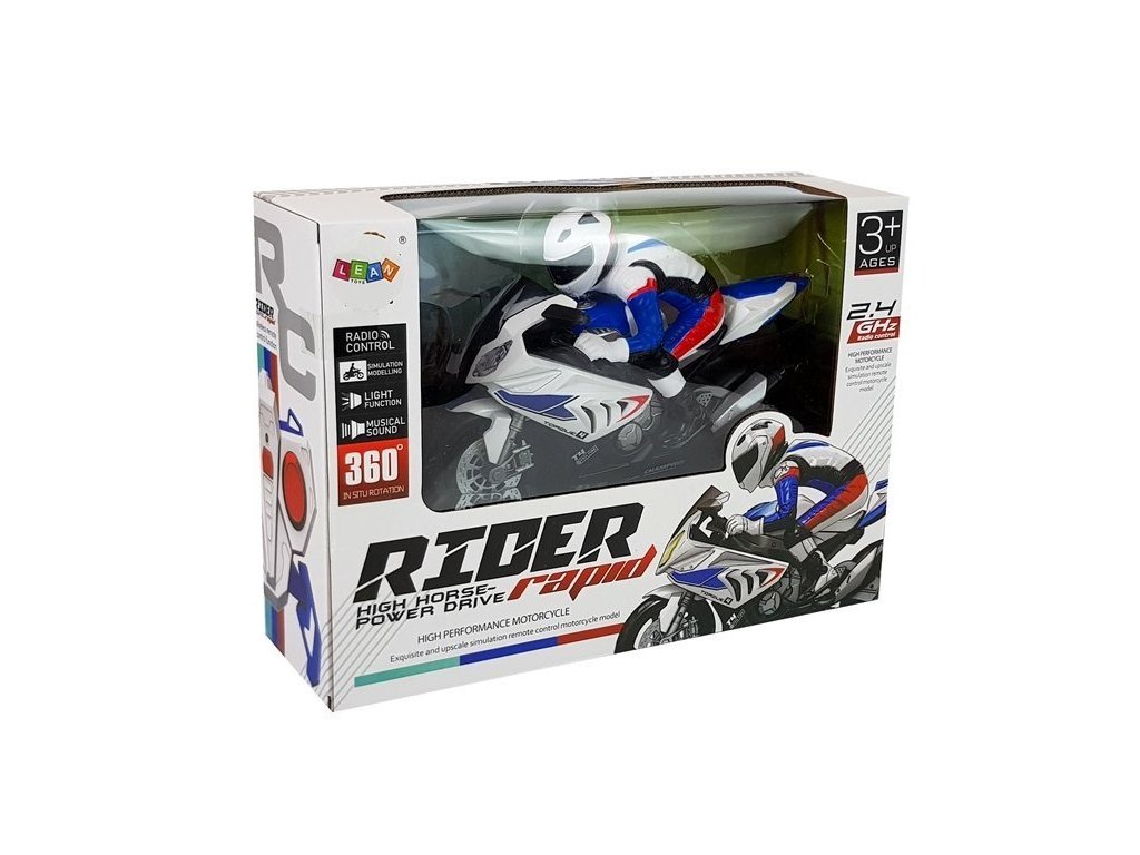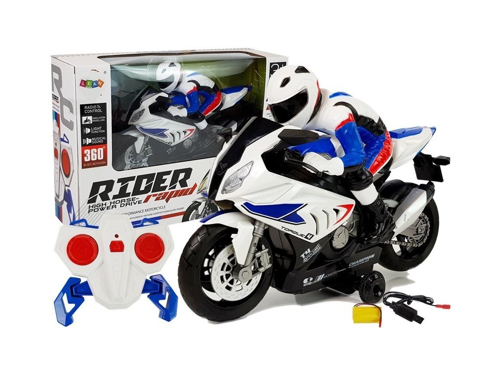 A motorozás egy szórakoztató tevékenység, amely órákon át remek szórakozást biztosít gyerekeknek és felnőtteknek egyaránt. A távirányító 2,4 GHz-es frekvencián működik. Remek fény- és hangeffektusokkal rendelkezik. Képes előrehajtani és 360 fokban elfordulni.