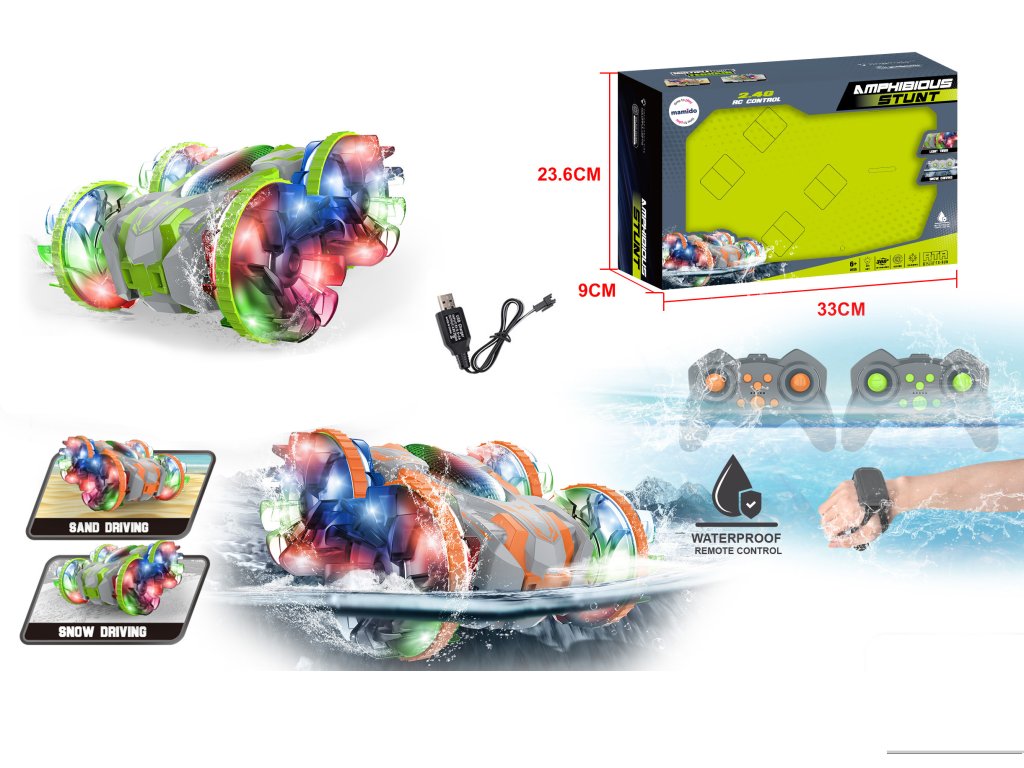 - Típus: kétéltű RC autó – szárazföld, homok, hó, víz