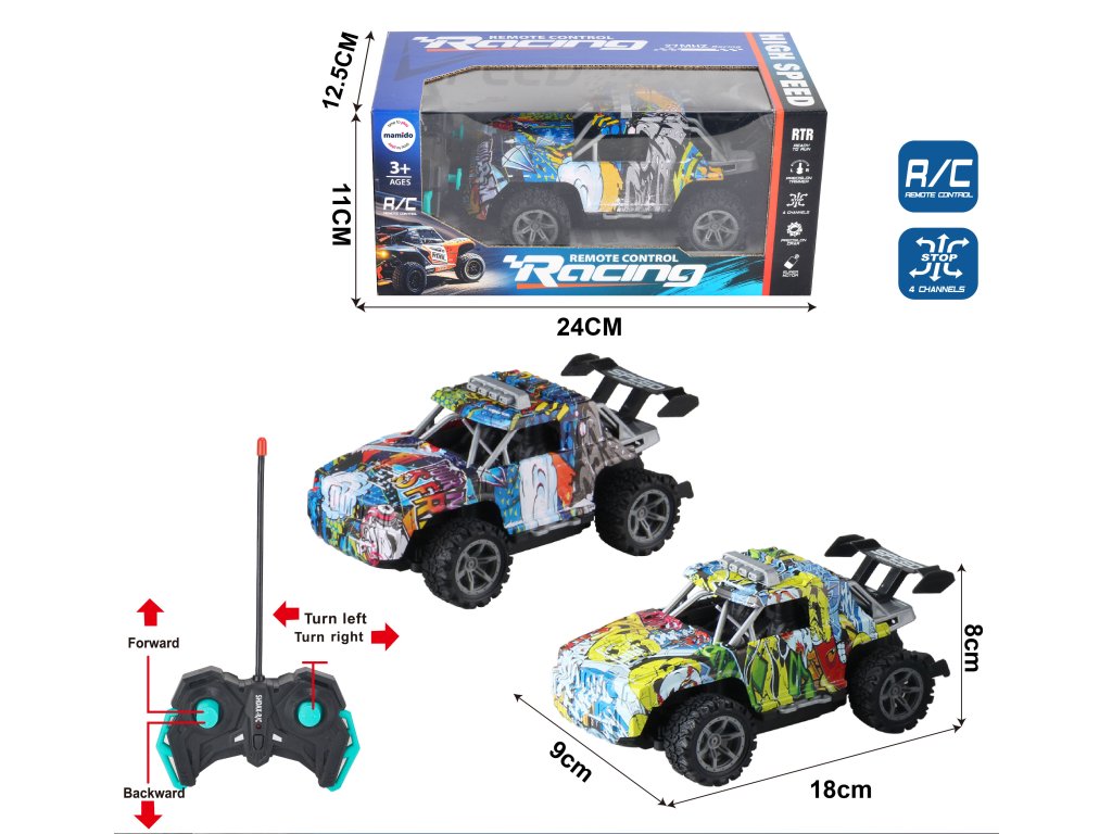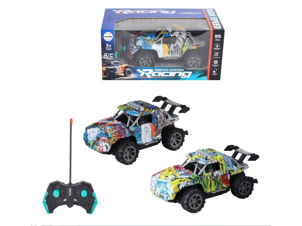 Stílusos RC terepjáró graffiti dizájnnal adrenalinteli, szórakoztató utazást hoz a gyerekeknek. Az irányításnak köszönhetően képes előre, hátra, balra és jobbra haladni. A modell vonzó megjelenéssel, nagy hátsó spoilerekkel és sportos részletekkel tűnik ki, amelyek egy valódi versenyautóra emlékeztetnek.