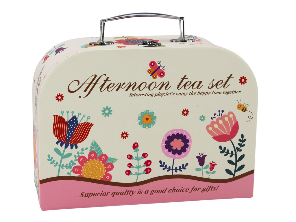 A kofferben mindent megtalál, amire szüksége van egy felejthetetlen teaparti megszervezéséhez. A készlet kis és nagy tányérokból, aranyos teáskannából, csészékből, tálcából, sütitartóból és különféle csábító sütiből áll. Minden elem gondosan készült, színei és mintái nagyon vonzóak a gyerekek számára, kreatív játékra ösztönzik őket.