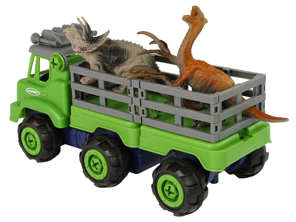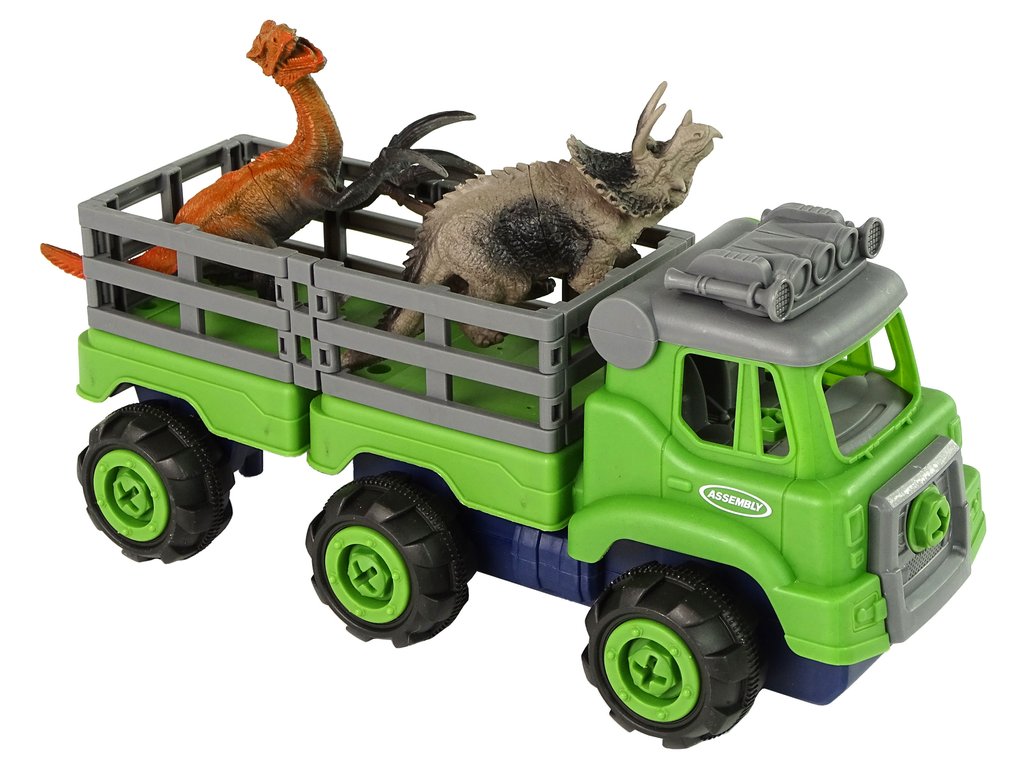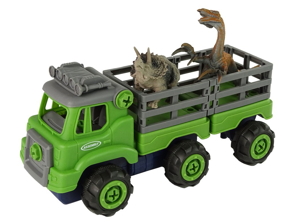 Bemutatkozik egy teherautó, ideális szállításhoz. Ha együtt játszunk ezzel a tárggyal, az tökéletesen befolyásolja gyermekét, felkelti a kíváncsiságot, és ösztönzi az aktív játékot és az őskori állatok megismerését. A teherautóval való játék után észreveheti a gyermek tapintási és vizuális érzékelésének erősödését. Számos játékhelyzetben jól működik: építkezésen, dinoszauruszparkban, ez a gyermek képzeletétől függ. A vele való játék hatással lesz a gyermek képzeletére és kreativitására, valamint a logikus gondolkodás képességére. A különféle elemek, például a kerekek, az utastér tetejének lecsavarásának és elforgatásának lehetősége növeli a pontosságot és fejleszti a kézi készségeket. Az autóban csavarok vannak, amelyek rögzítik a kocsi egyes elemeit. A játék sok órányi szórakozást biztosít, nem csak a játékautóval való játék formájában, hanem az erejét is kipróbálhatja. Egy másik előny a gyermek fejlődése.