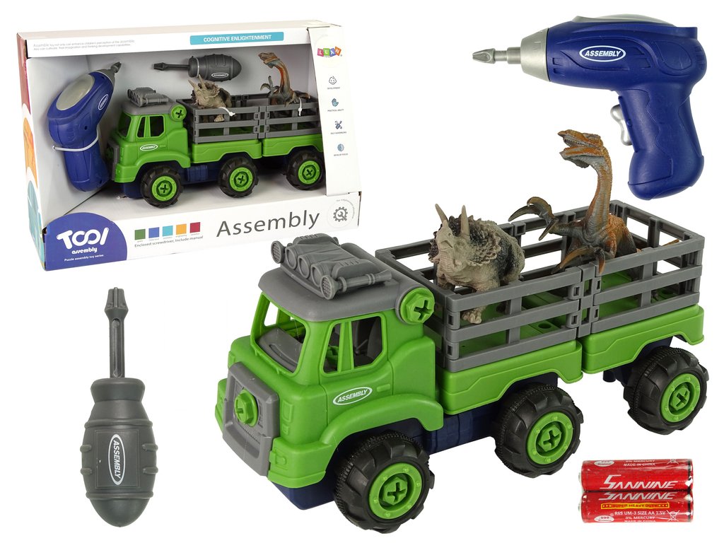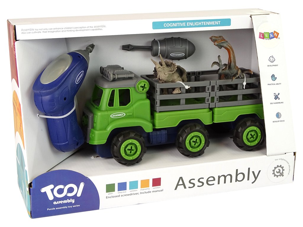 Dinoszaurusz teherautó furgon fúróval, csavarhúzóval és két dinoszaurusszal