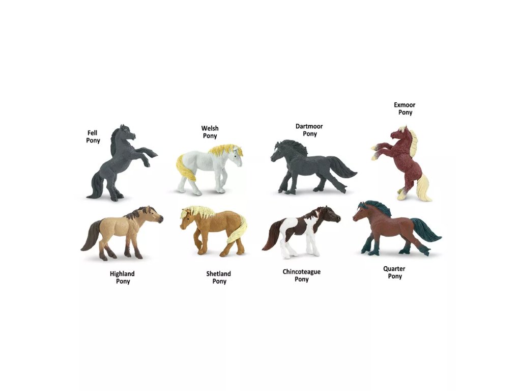 Nyolc részletesen kidolgozott póni figura egy praktikus tubusban. A figurák kézzel festettek, és didaktikai eszközként szolgálnak az egyes fajták tipikus jellemzőinek megismeréséhez.