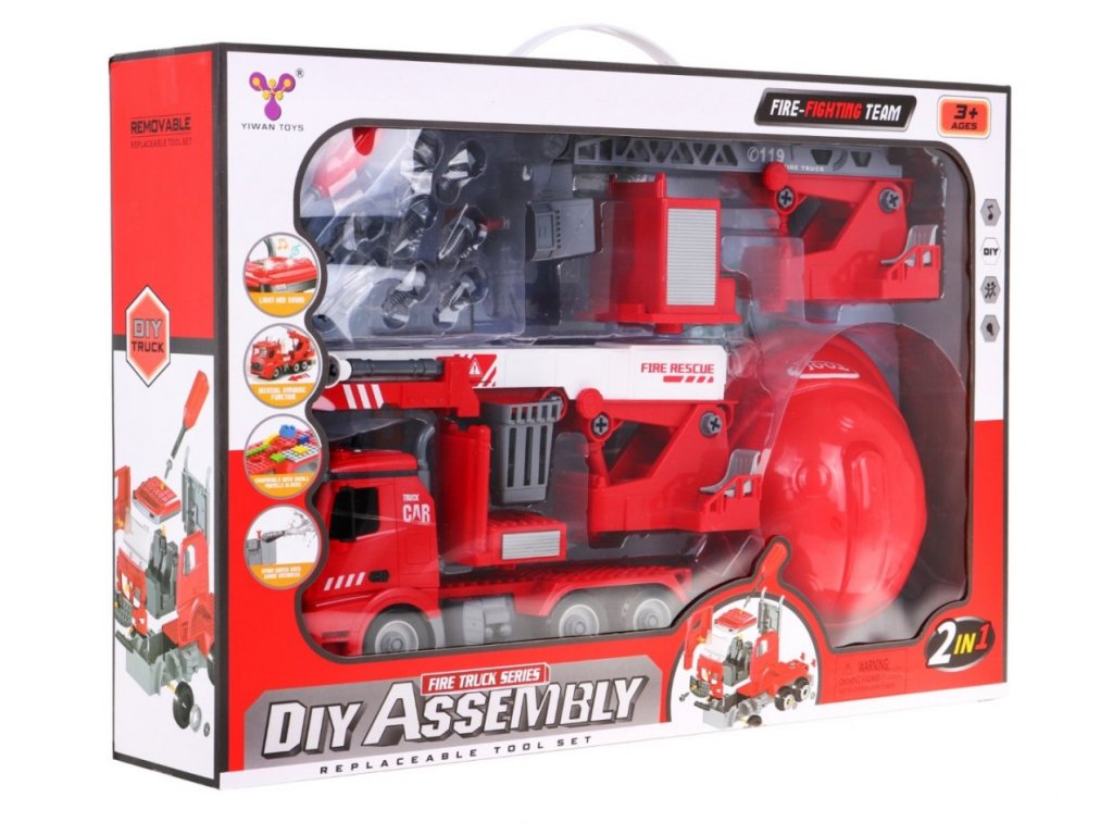 Azoknak a fiúknak, akik arról álmodoznak, hogy egyszer tűzoltóvá váljanak, egy kiváló készletet, egy 2 az 1-ben tűzoltóautót és sisakot kínálunk. A játék 3 éves kortól gyermekek számára készült. A tűzoltóautót szerkezeti részekből kell összeszerelni, beleértve a csavarokat és egyéb szerszámokat is. Az autó kivehető, kihúzható és 180 fokban elforgatható kosaras emelővel vagy vízágyús, ténylegesen működő kihúzható és elforgatható létrával rendelkezik.