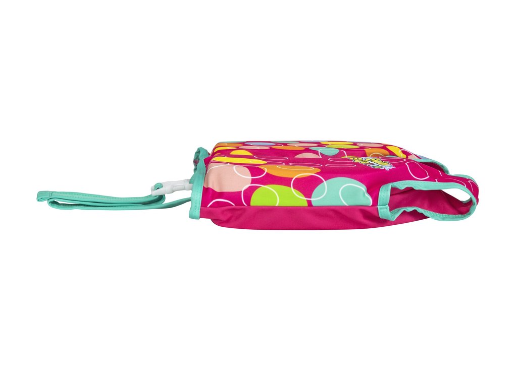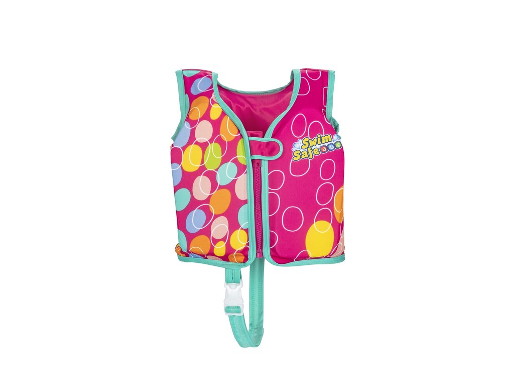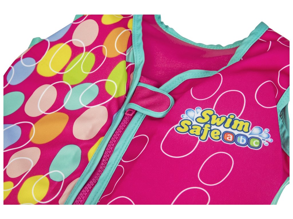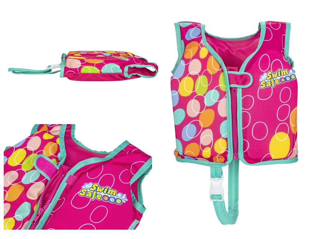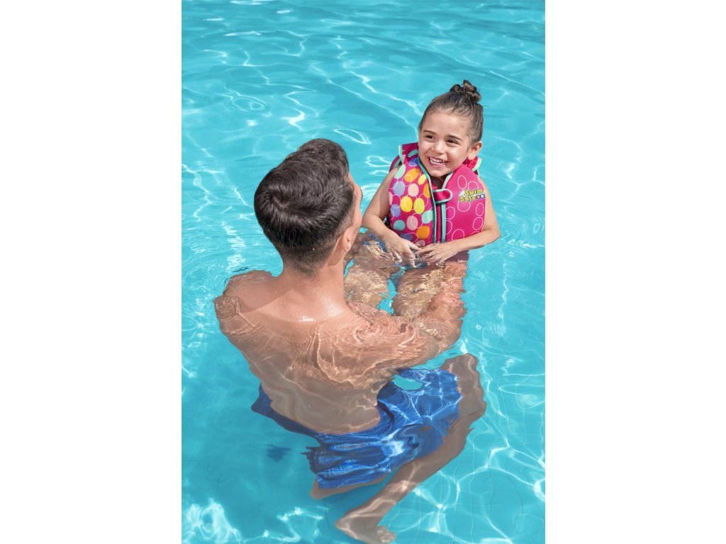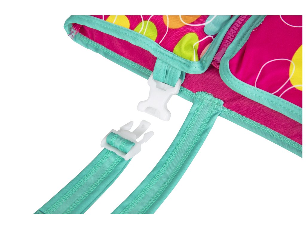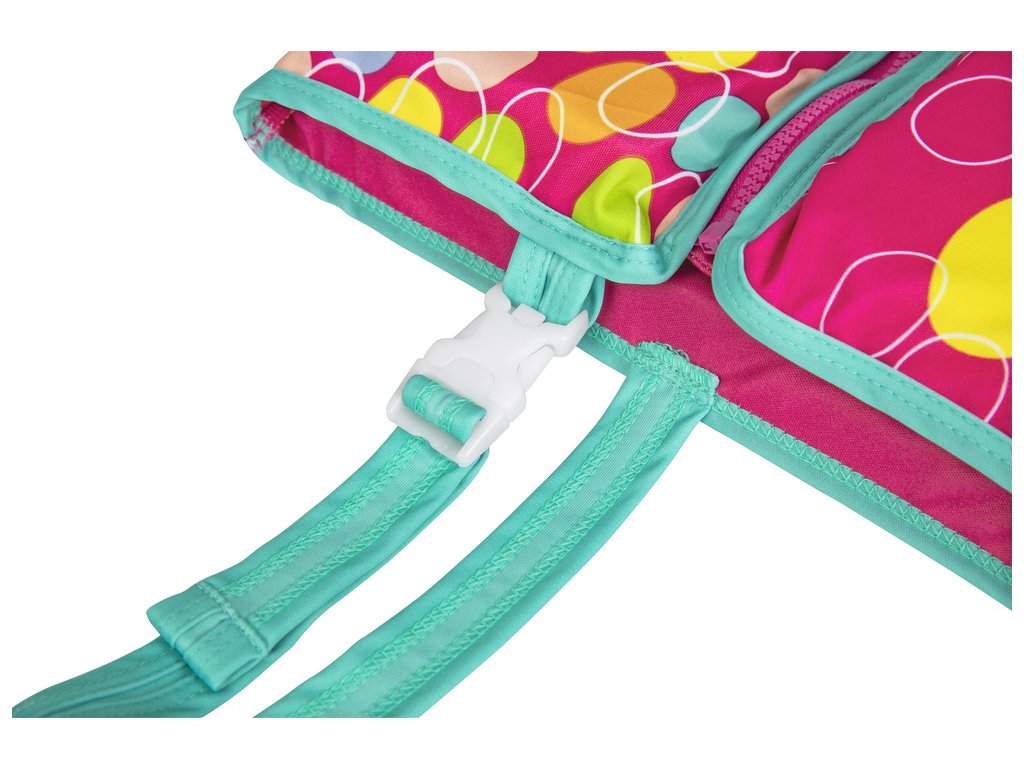A mellény cipzárral és csattal rendelkezik, hogy a gyerek ne essen ki, a pánt hossza állítható és tökéletesen illeszkedik a gyerekhez. A mellény kényelmes anyagból és beépített habszivacs betétekkel készült, és kiegyensúlyozott felhajtóerőt biztosít a gyermek számára a vízen. A színes dizájn 50+ UPF fényvédelmet biztosít, hogy megakadályozza a színek fakulását.