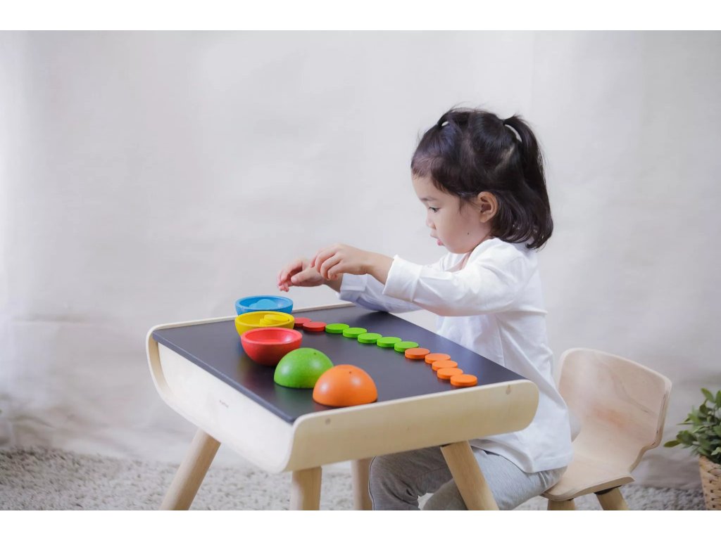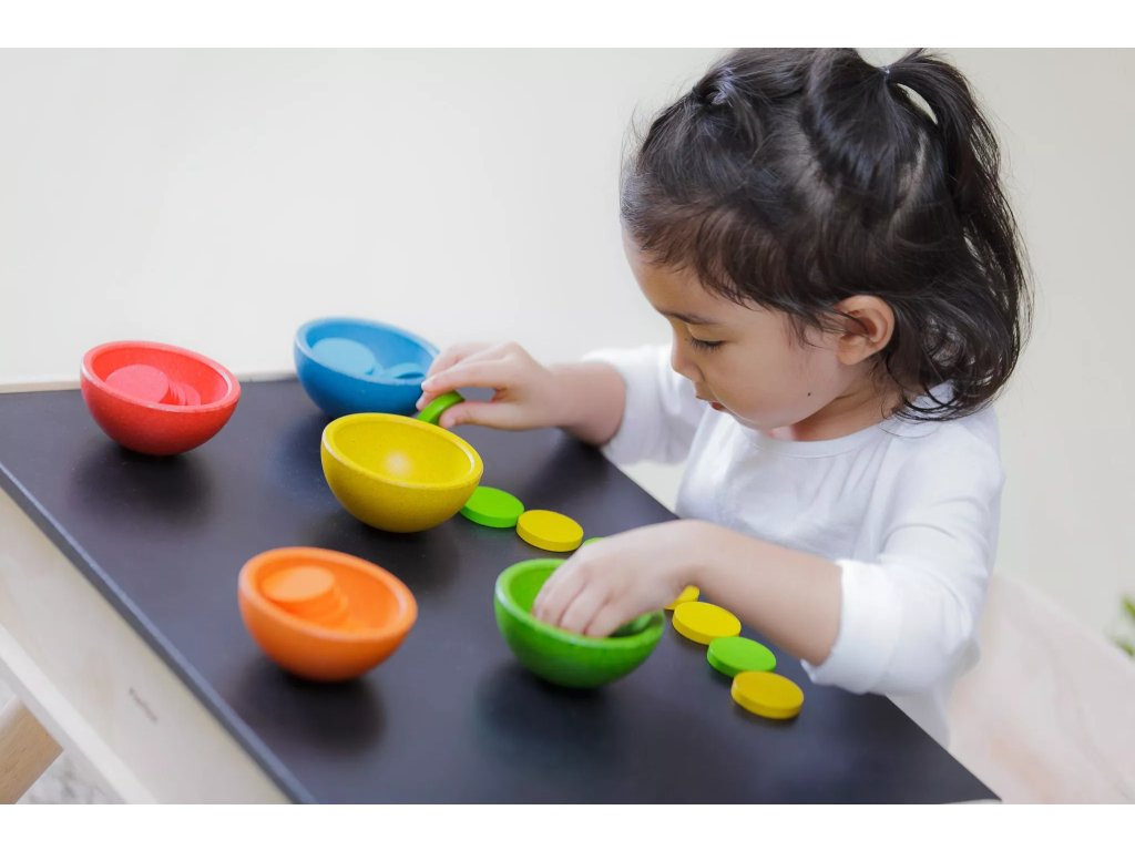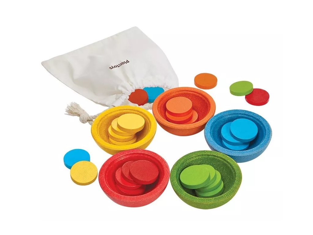 Montessori-ihlette oktatójáték kisgyermekek számára, amely elősegíti a finommotoros készségek, a szókincs, a koordináció és a türelem fejlesztését. A gyermekek a színek szerint válogatják a zsetonokat, és a megfelelő poharakba helyezik őket, ezáltal alapvető tapasztalatokat szereznek a válogatás és a logikus gondolkodás terén.