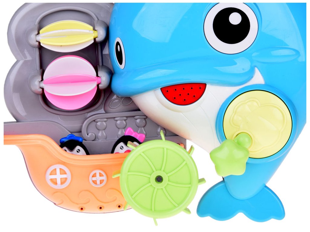 Vidám delfin fürdőjáték csónakkal és pingvinekkel