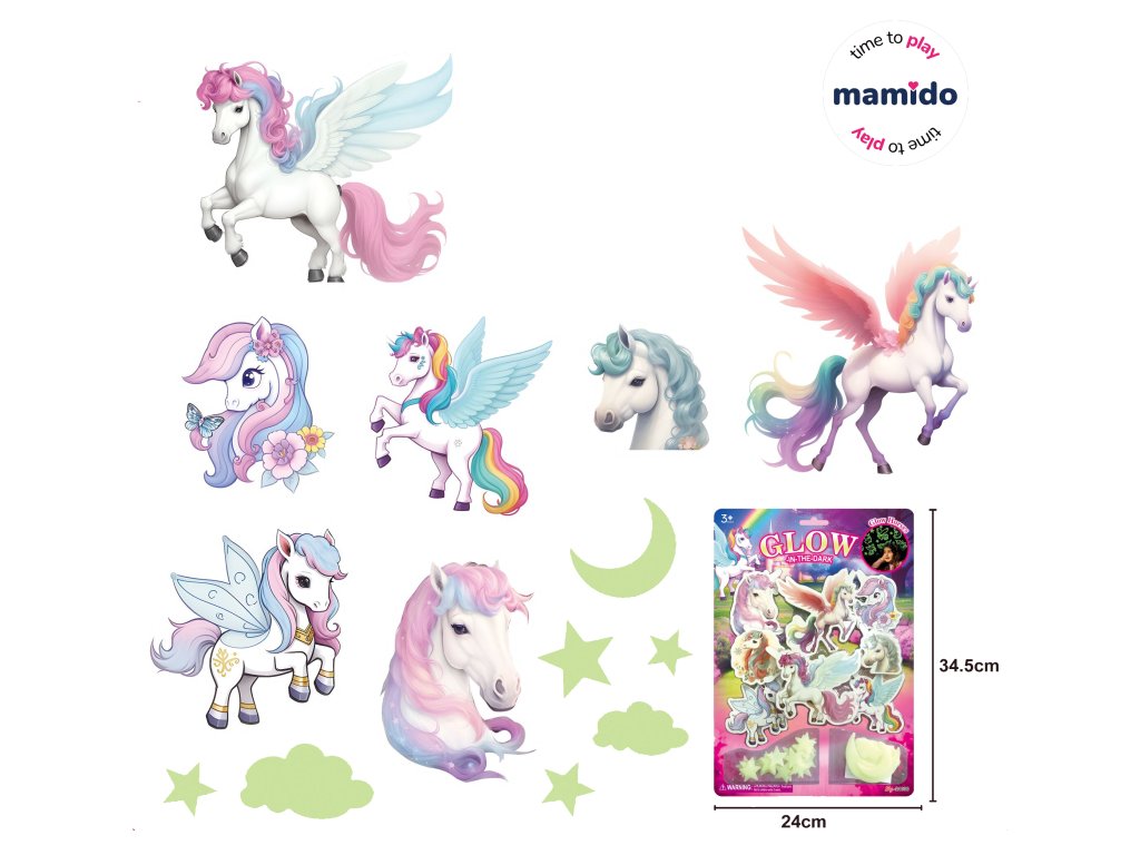 Varázslatos, fantáziadús szobát teremts a gyerekeknek! Ez a világító matricakészlet színes egyszarvúakat, pegazusokat és mesebeli motívumokat tartalmaz, amelyek sötétben finoman világítanak, és a szobát álmodozó, varázslatos birodalommá változtatják.
