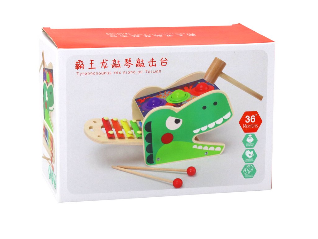 Vörös fából készült dinoszaurusz kalapáccsal és xilofonnal 2 az 1-ben