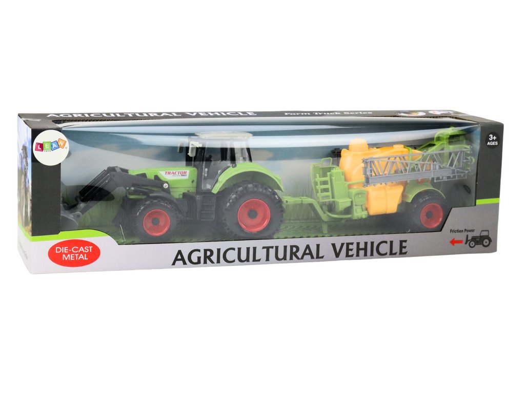 Traktoros mezőgazdasági kotrógép zöld permetezővel